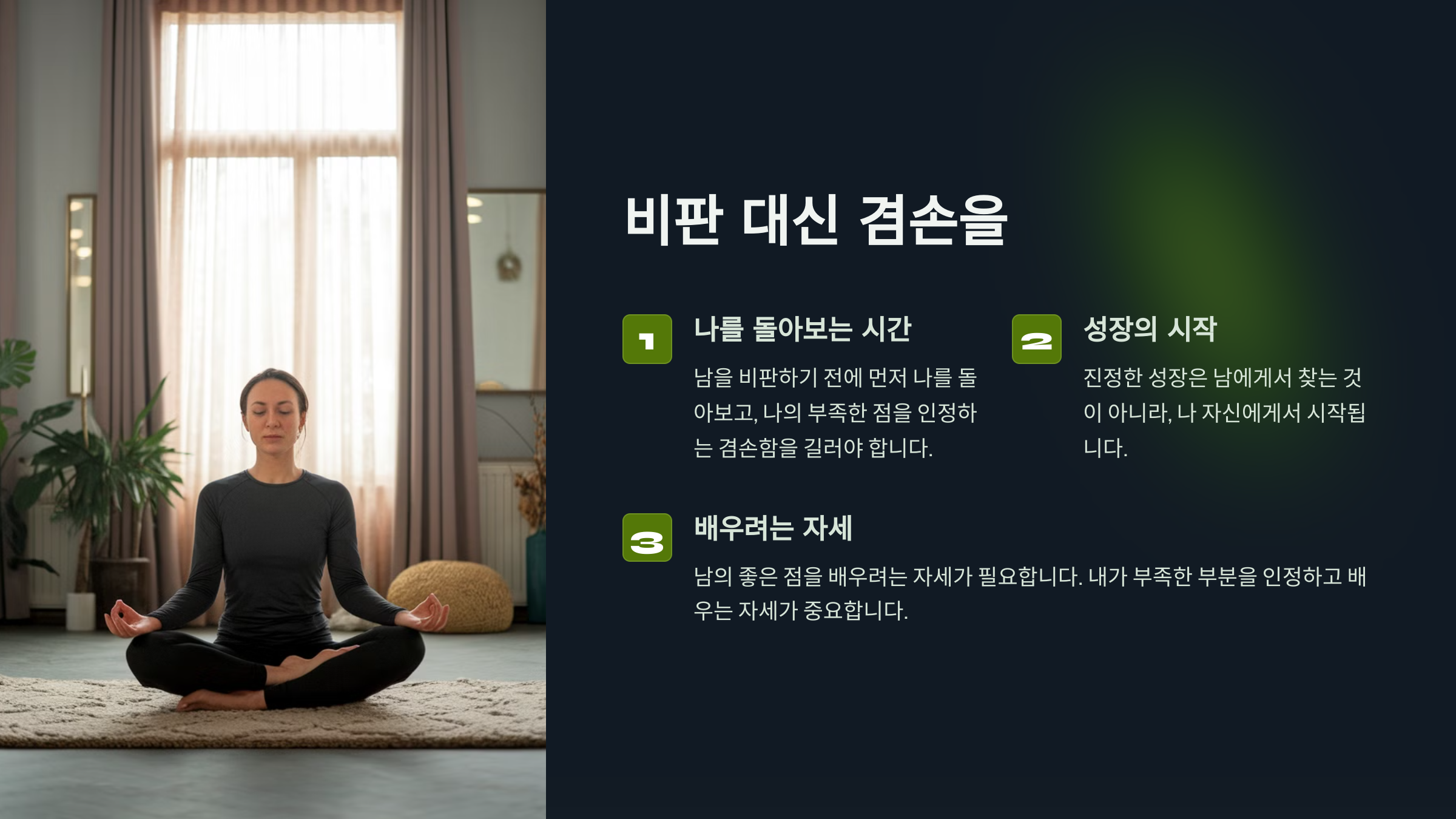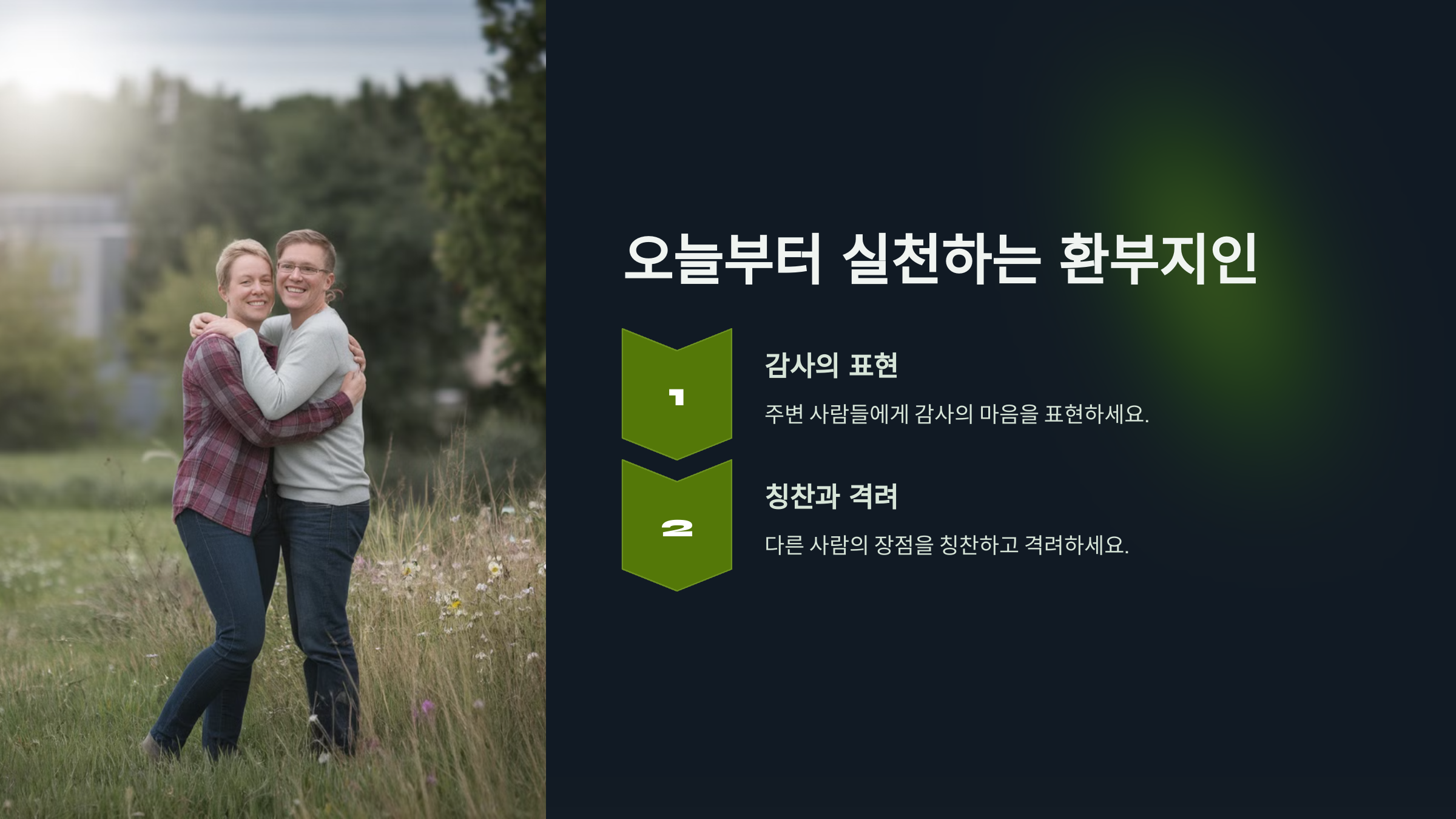 오늘부터라도 주변 사람들의 장점을 찾아보고, 그들에게 진심으로 감사하는 마음을 가져보는 것은 어떨까요? 이 작은 실천이 우리를 더욱 성숙한 사람으로 만들어 줄 것이다.