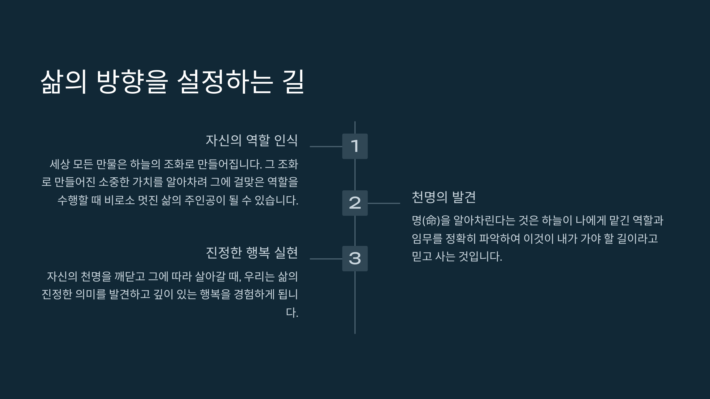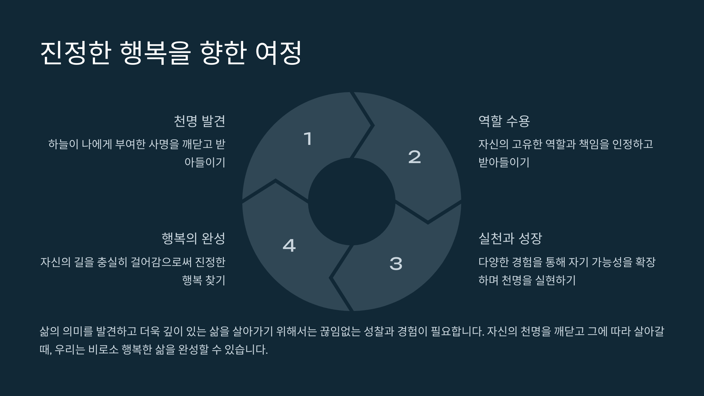 우리는 세상이라는 무대 위의 주인공입니다. 각자에게 맡겨진 역할, 즉 천명을 찾아 자신만의 연기를 펼쳐나갈 때 비로소 인생에서 가장 큰 행복을 느낄 수 있습니다. 나의 천명 찾기 삶의 의미