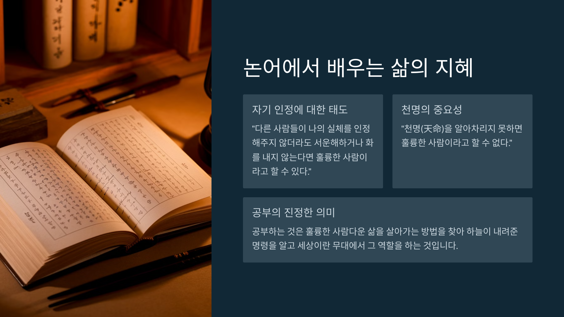 논어(論語)엔 첫 소절에 ‘다른 사람들이 나의 실체를 인정해주지 않더라도 서운해하거나 화를 내지 않는다면 훌륭한 사람이라고 할 수 있다’라고 말했고, 논어 마지막 구절에서는 ‘천명(天命)을 알아차리지 못하면 훌륭한 사람이라고 할 수 없다’라고 단적으로 말씀했으니 깊은 의미가 있다. 공부하는 것은 훌륭한 사람다운 삶을 살아가는 방법과 방안을 찾아 나서는 것으로 하늘이 나에게 내려준 명령(命令)을 알아 세상이란 무대에서 그 역할을 하는 것이라 할 수 있다.
