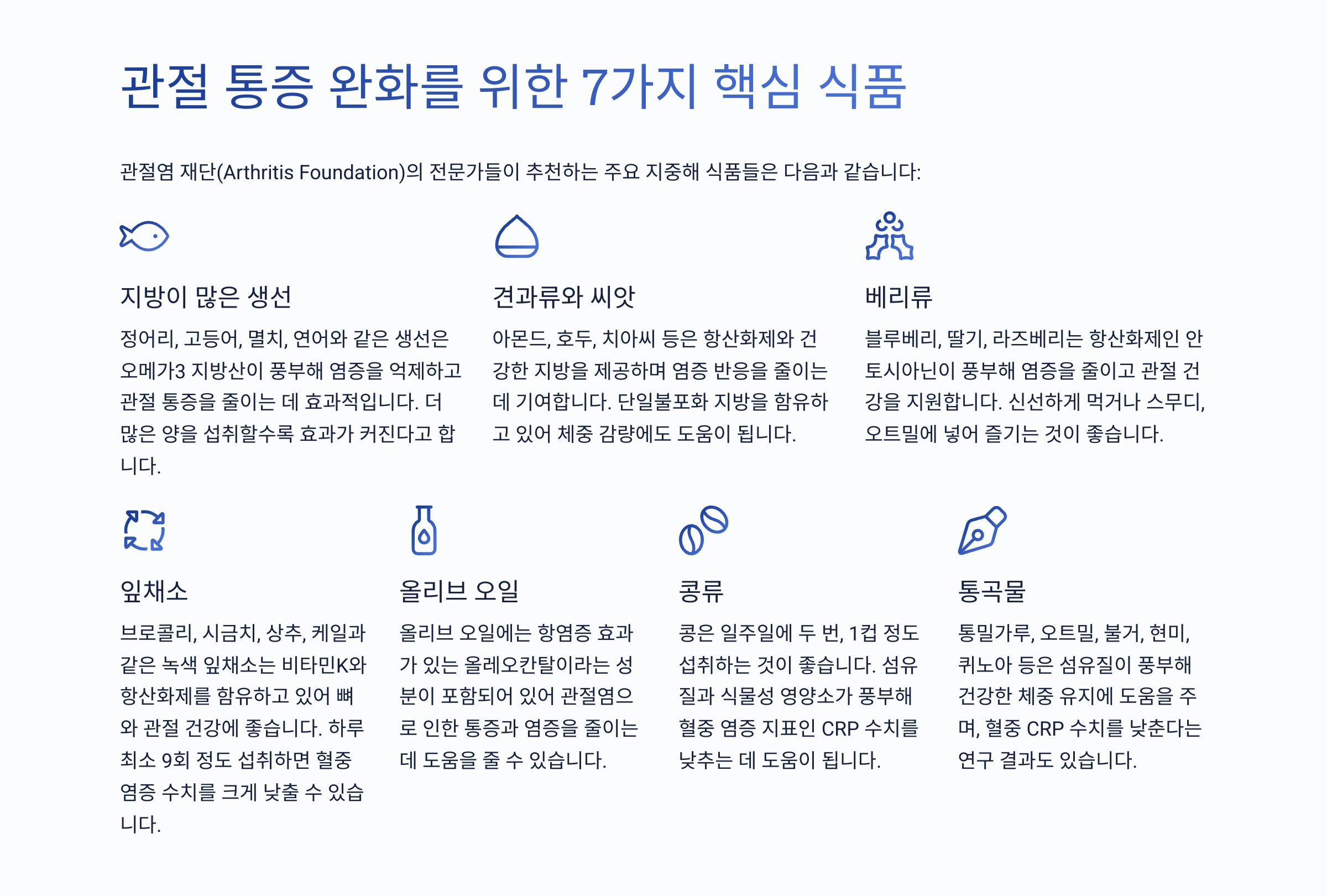 관절 통증은 완벽히 치료할 수 없더라도, 적절한 식이요법과 생활 습관 관리를 통해 증상을 크게 완화할 수 있습니다. 오늘부터 지중해식 식단을 시작해 보세요.