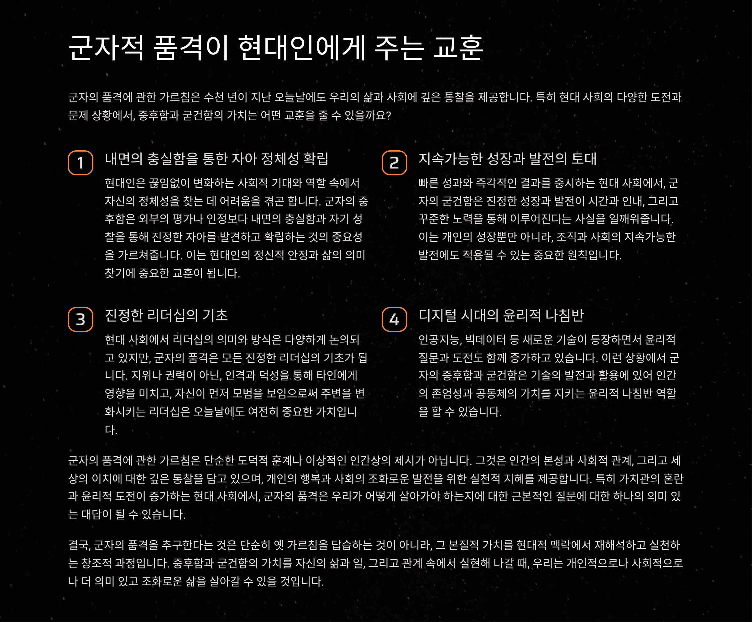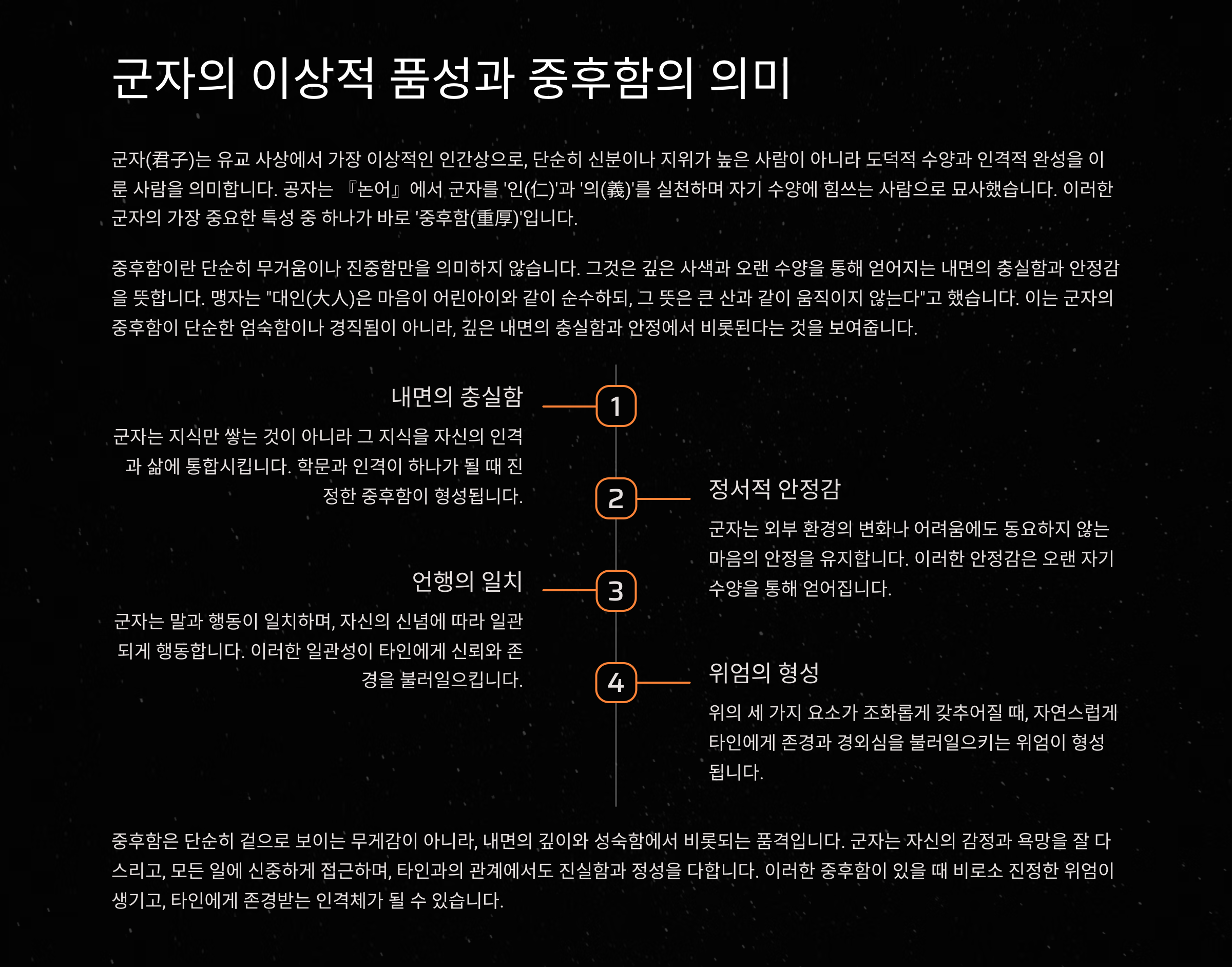 결국, 군자의 품격을 추구한다는 것은 단순히 옛 가르침을 답습하는 것이 아니라, 그 본질적 가치를 현대적 맥락에서 재해석하고 실천하는 창조적 과정입니다. 중후함과 굳건함의 가치를 자신의 삶과 일, 그리고 관계 속에서 실현해 나갈 때, 우리는 개인적으로나 사회적으로나 더 의미 있고 조화로운 삶을 살아갈 수 있을 것입니다.