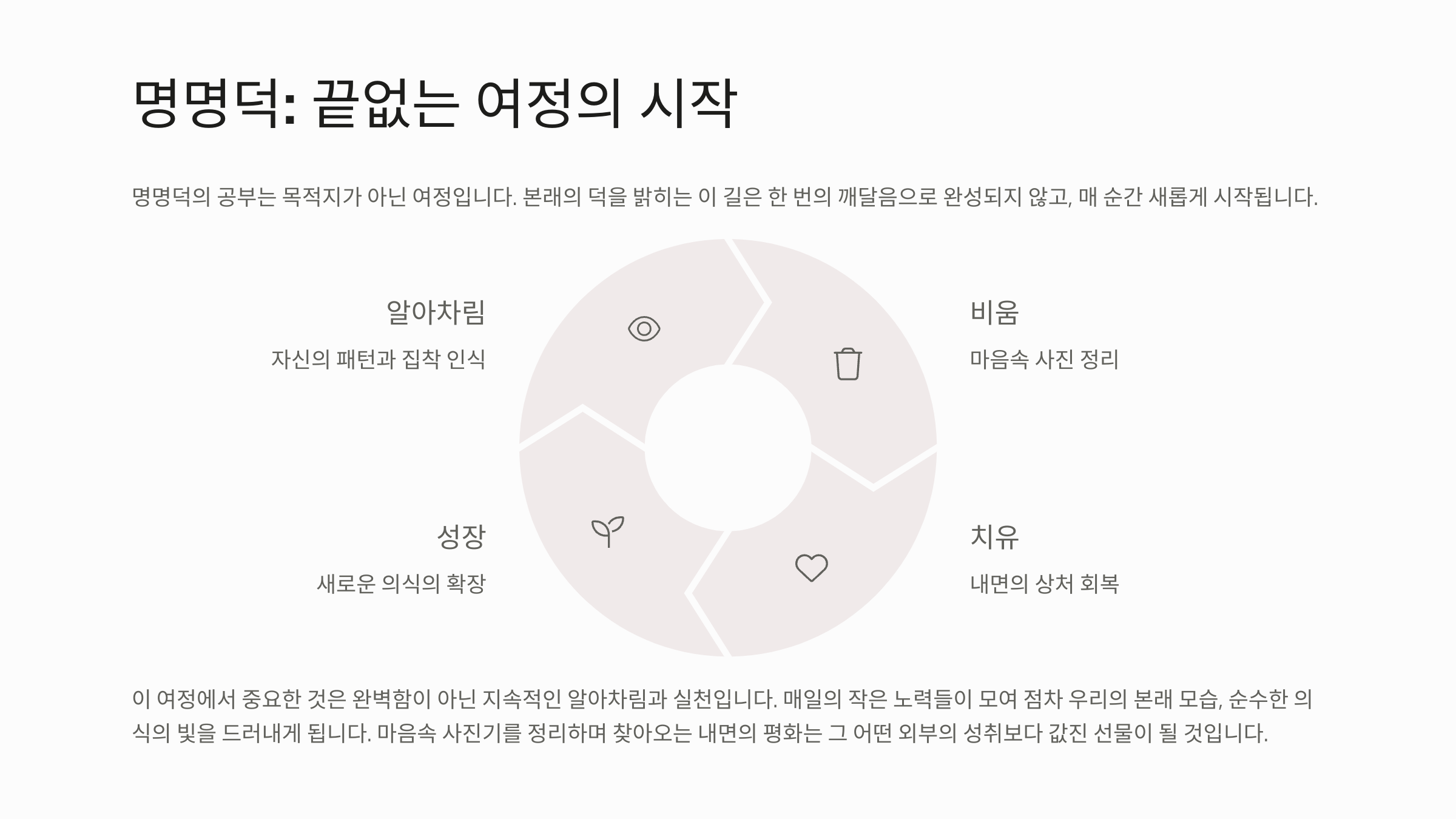명명덕의 공부는 목적지가 아닌 여정입니다. 본래의 덕을 밝히는 이 길은 한 번의 깨달음으로 완성되지 않고, 매 순간 새롭게 시작됩니다.
