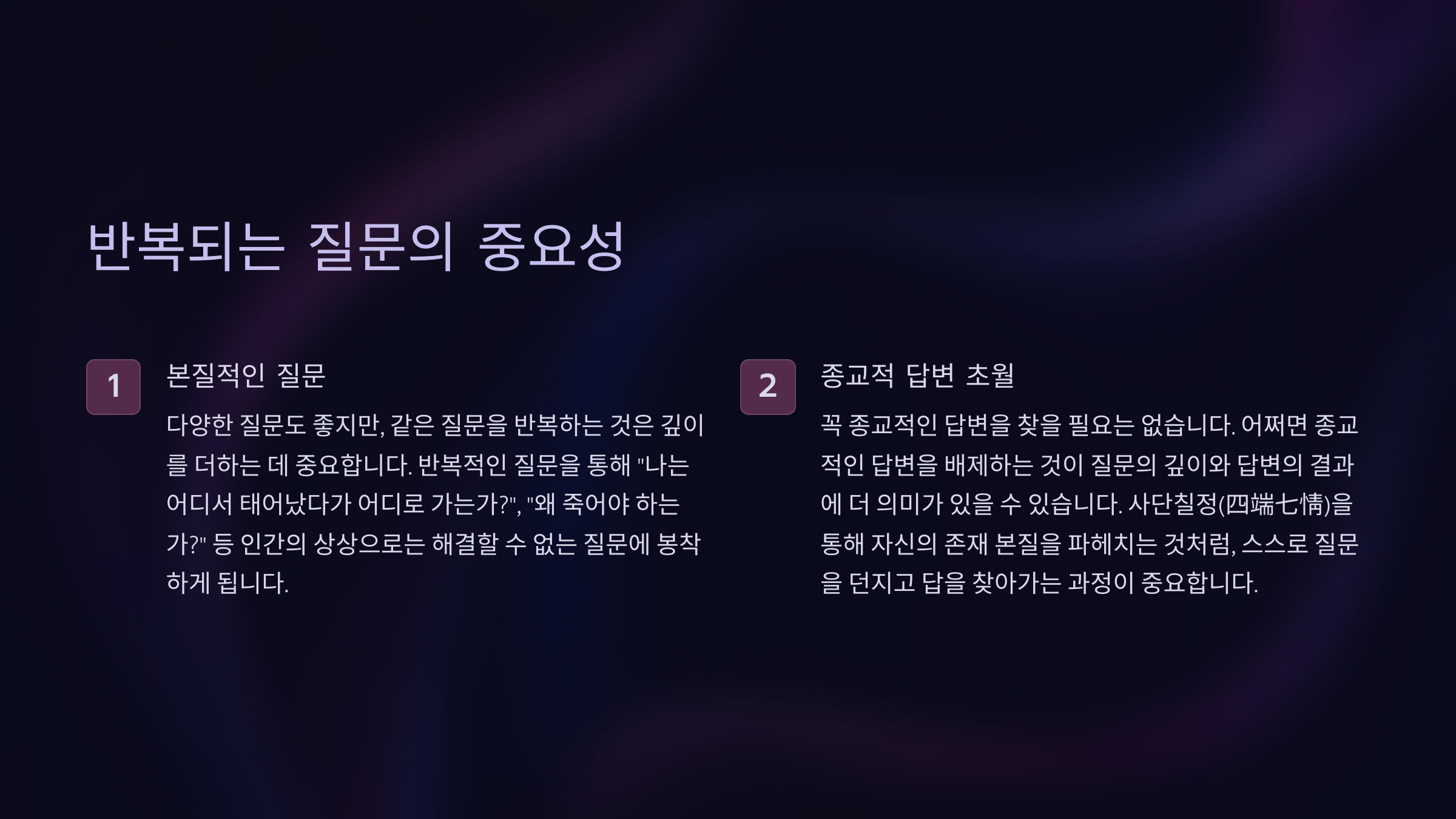 다양한 질문도 좋다. 하지만, 같은 질문을 반복하는 것이 의미가 있다.’라는 말은 질문을 통해 우리의 생각을 깊이 있게 파고들 수 있다는 것을 의미한다. 같은 질문을 반복하며 다양한 관점에서 바라보면 새로운 시각을 얻을 수 있다. 사단칠정 운운도, 결국엔 나()라는 자신의 존재 본질을 파헤친 결과물이 아닌가? 라는 말은 인간의 감정과 행동을 이해하기 위해서는 자기 자신에 대한 탐구가 필요하다는 것을 보여준다.