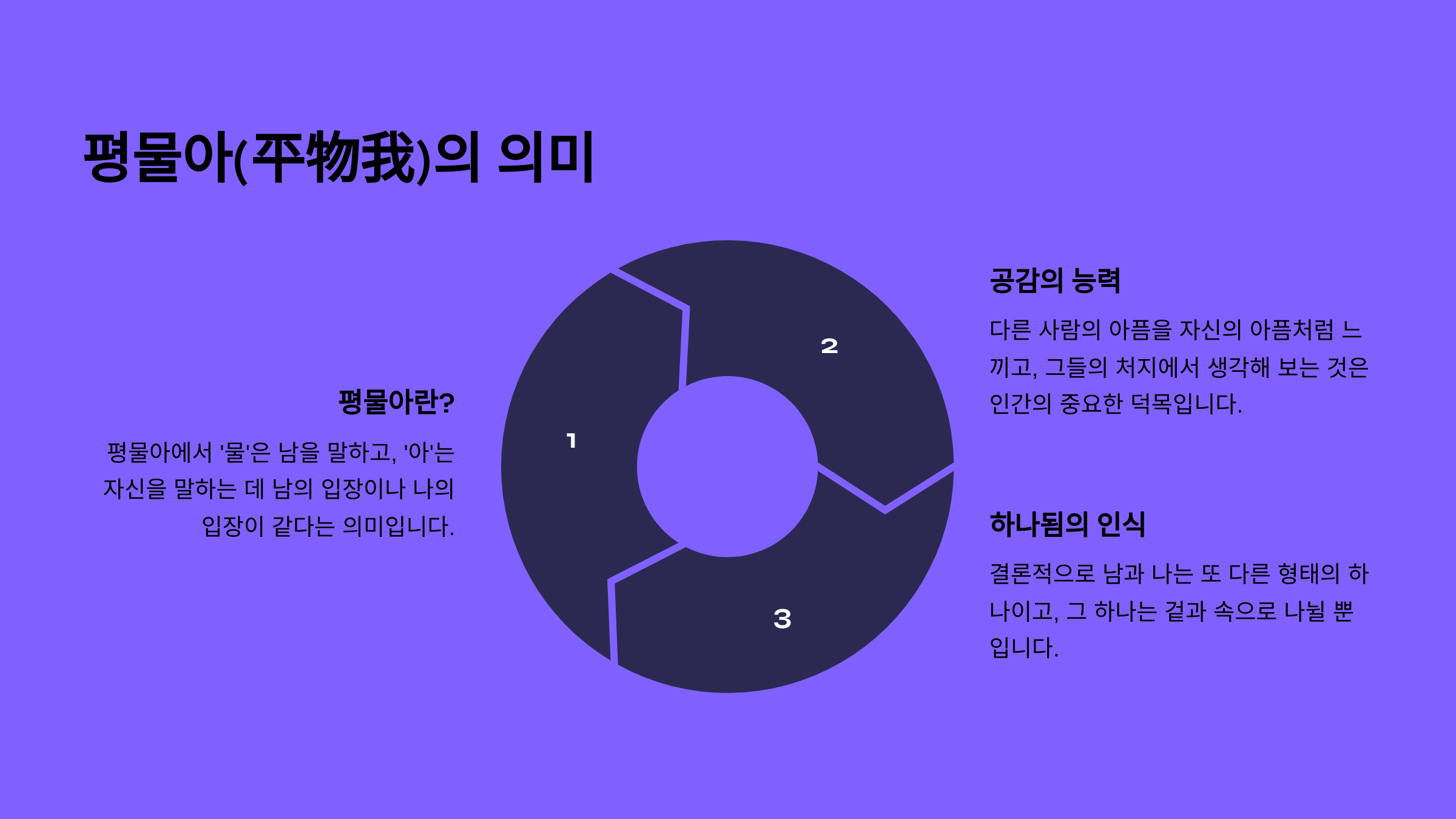 ‘평물아’라는 말은 '남과 나의 입장이 같다'라는 의미다. 즉, 다른 사람의 아픔을 자신의 아픔처럼 느끼고, 그들의 처지에서 생각해 보는 것이다. 이렇게 되면 우리는 더 이상 남과 나를 구분하지 않고, 모든 사람을 하나의 존재로 바라볼 수 있게 된다.