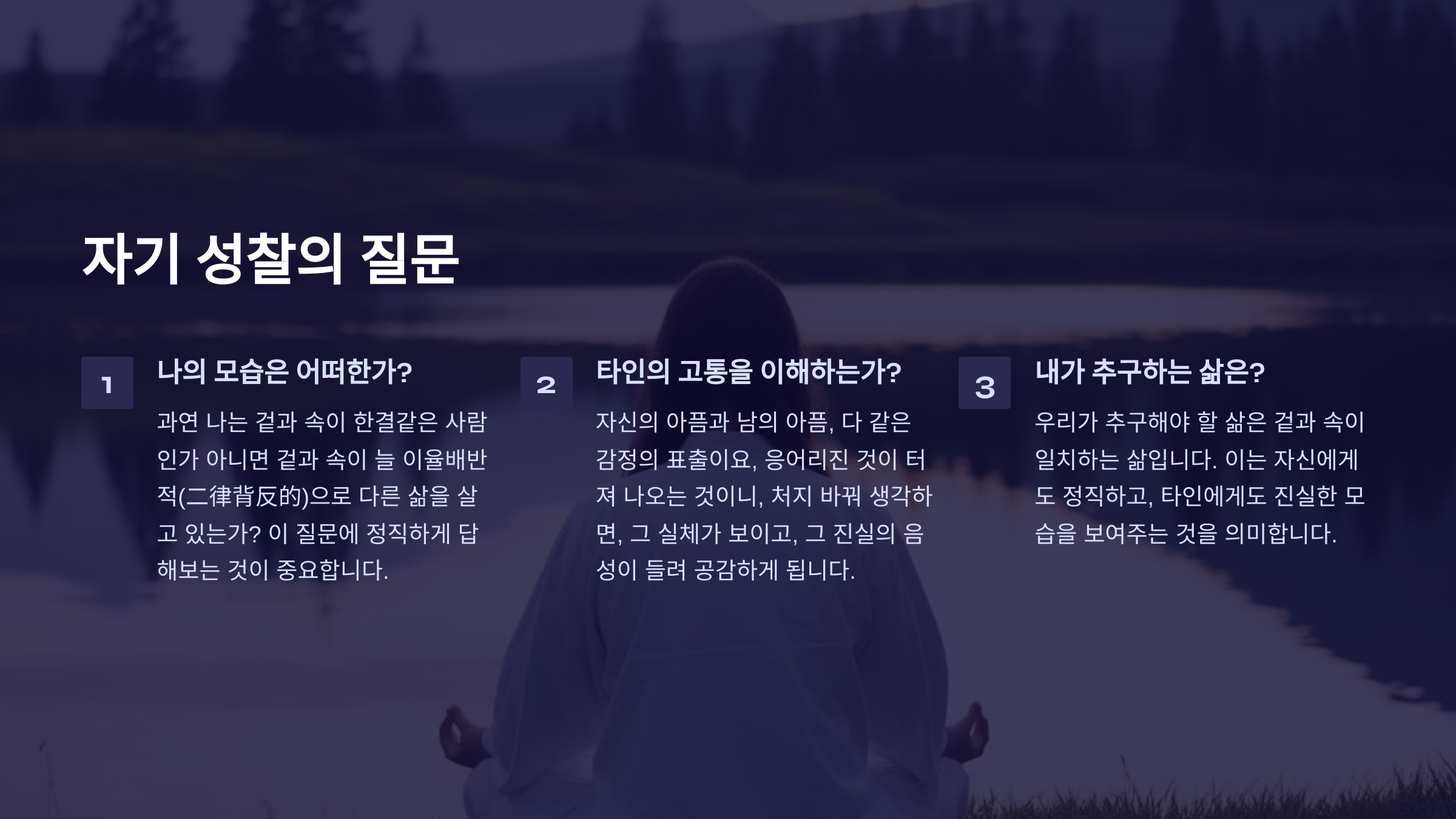 오늘 하루, 나는 겉과 속이 다른 모습을 하고 있지는 않은지 스스로에게 질문해 보는 것은 어떨까요? 이 구절의 가르침을 통해 우리는 더욱 성숙하고 행복한 삶을 살 수 있을 것이다.