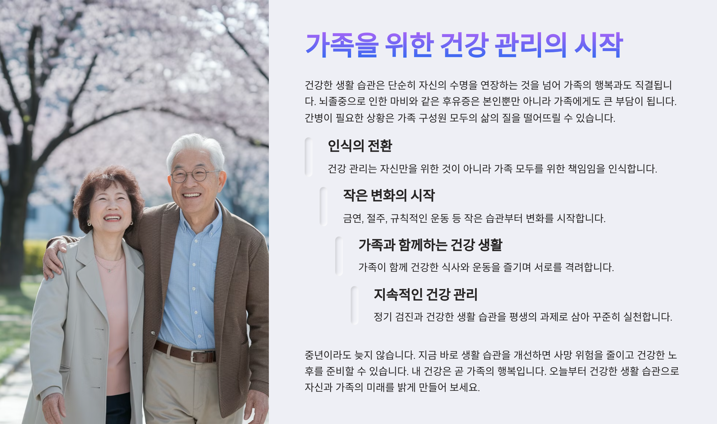 건강한 생활 습관은 단순히 자신의 수명을 연장하는 것을 넘어 가족의 행복과도 직결됩니다. 뇌졸중으로 인한 마비와 같은 후유증은 본인뿐만 아니라 가족에게도 큰 부담이 됩니다. 간병이 필요한 상황은 가족 구성원 모두의 삶의 질을 떨어뜨릴 수 있습니다.