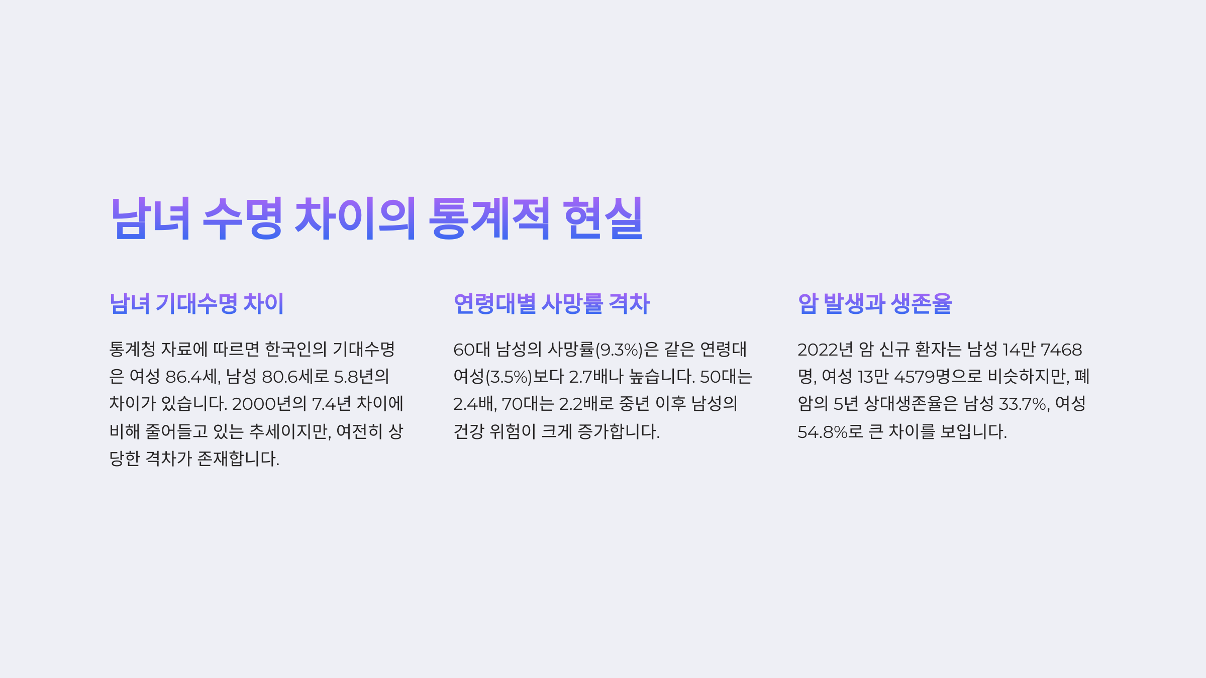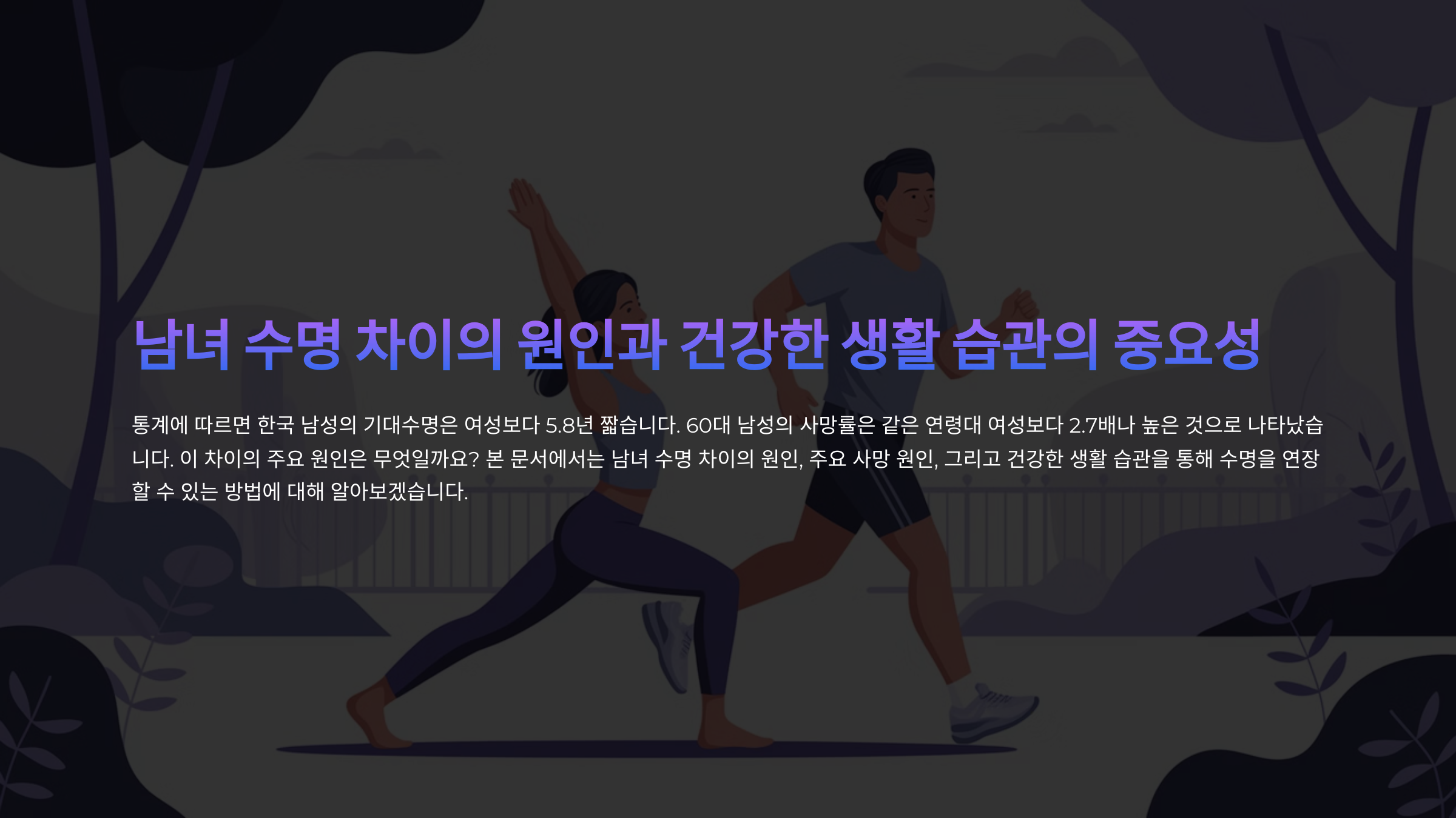 통계에 따르면 한국 남성의 기대수명은 여성보다 5.8년 짧습니다. 60대 남성의 사망률은 같은 연령대 여성보다 2.7배나 높은 것으로 나타났습니다. 이 차이의 주요 원인은 무엇일까요? 본 문서에서는 남녀 수명 차이의 원인, 주요 사망 원인, 그리고 건강한 생활 습관을 통해 수명을 연장할 수 있는 방법에 대해 알아보겠습니다.