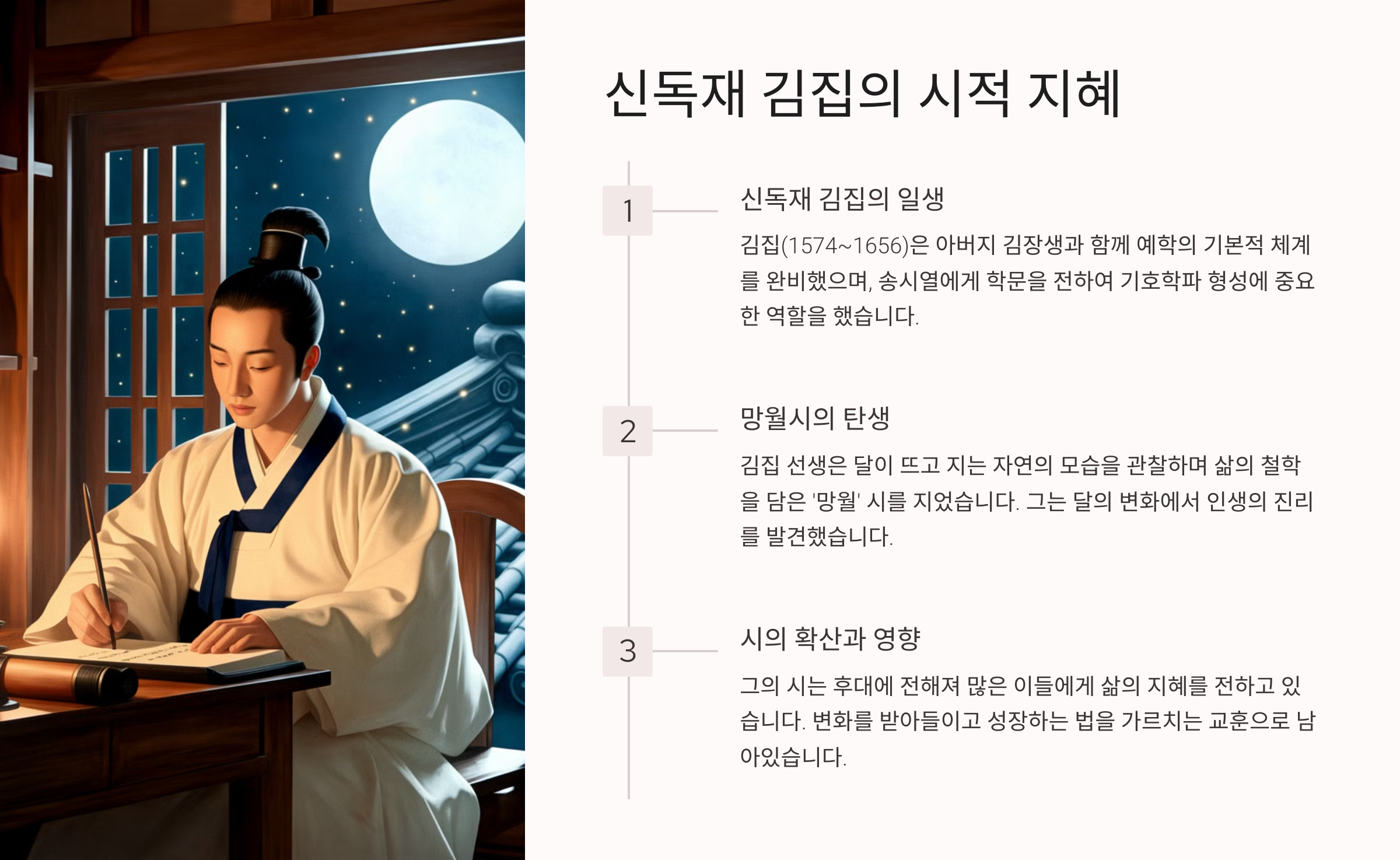 김집 선생은 달이 뜨고 지는 자연의 모습을 관찰하며 삶의 철학을 담은 '망월' 시를 지었습니다. 그는 달의 변화에서 인생의 진리를 발견했습니다.