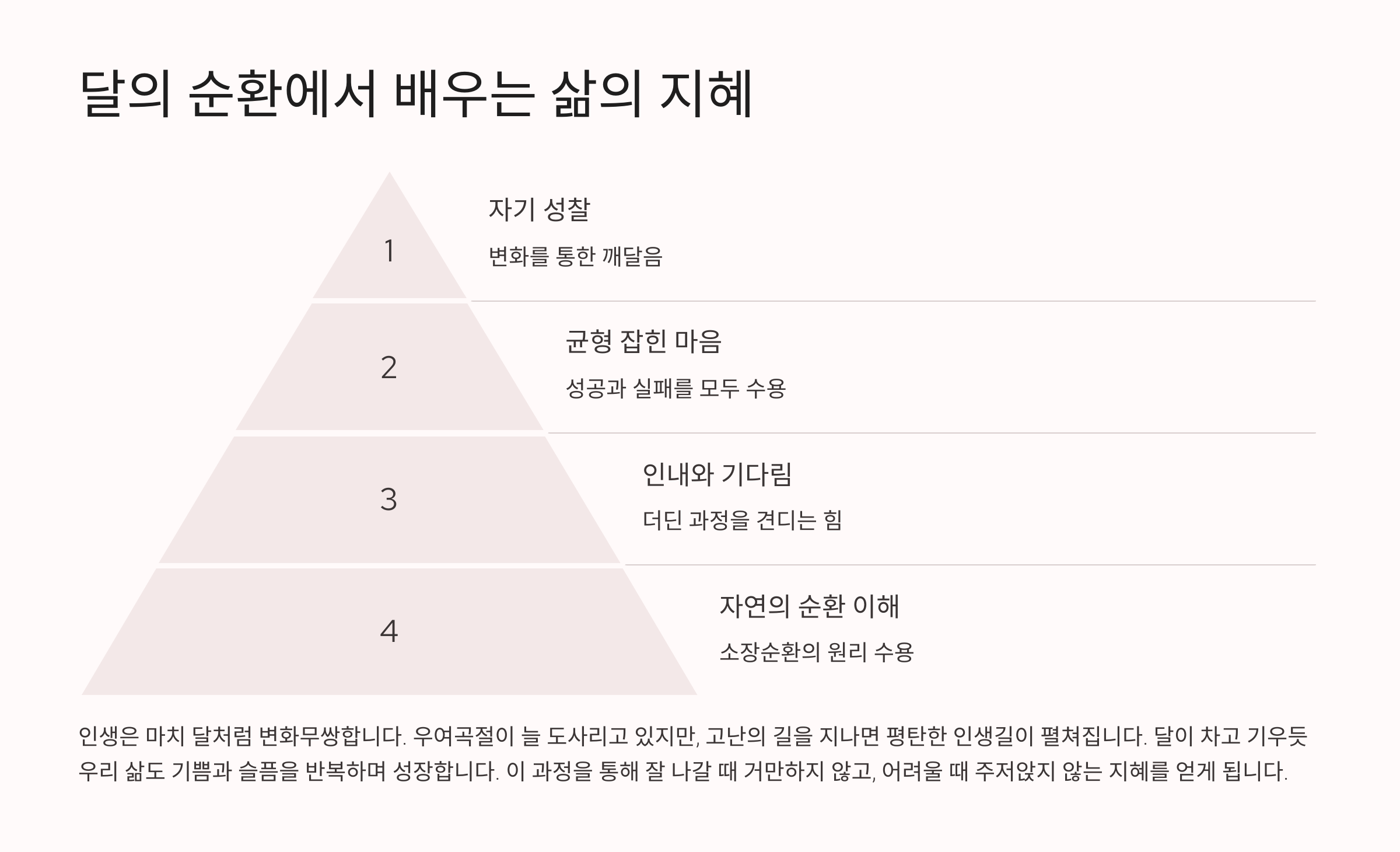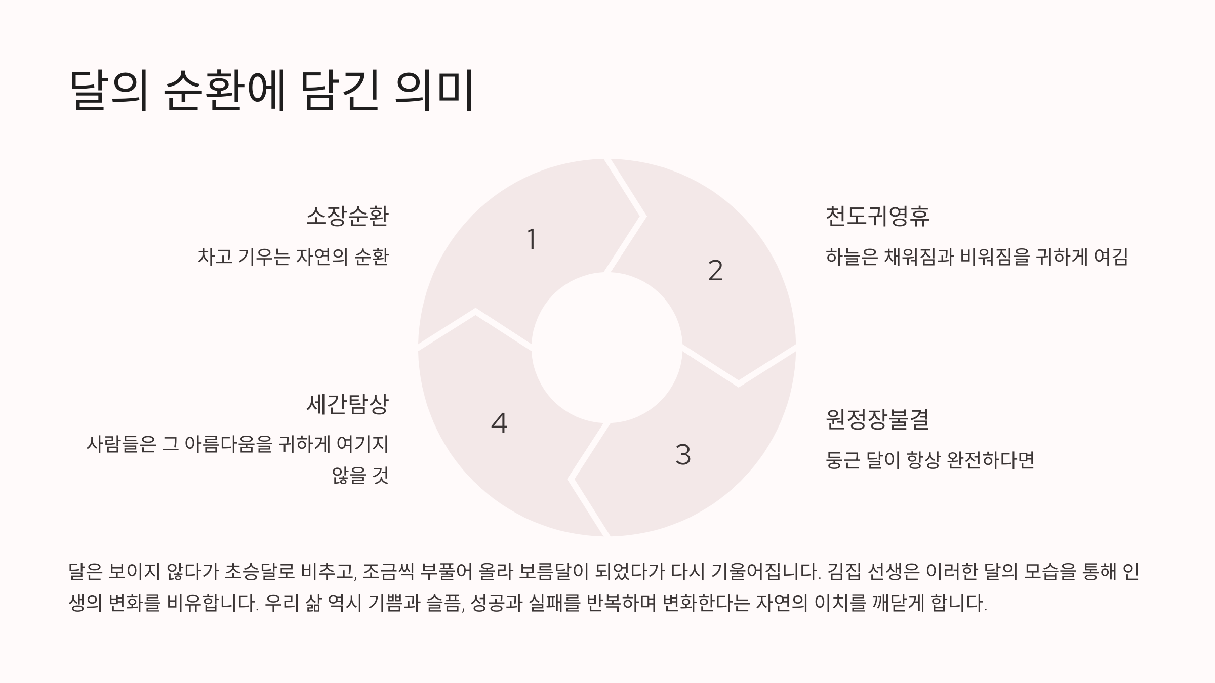 달은 보이지 않다가 초승달로 비추고, 조금씩 부풀어 올라 보름달이 되었다가 다시 기울어집니다. 김집 선생은 이러한 달의 모습을 통해 인생의 변화를 비유합니다. 우리 삶 역시 기쁨과 슬픔, 성공과 실패를 반복하며 변화한다는 자연의 이치를 깨닫게 합니다.