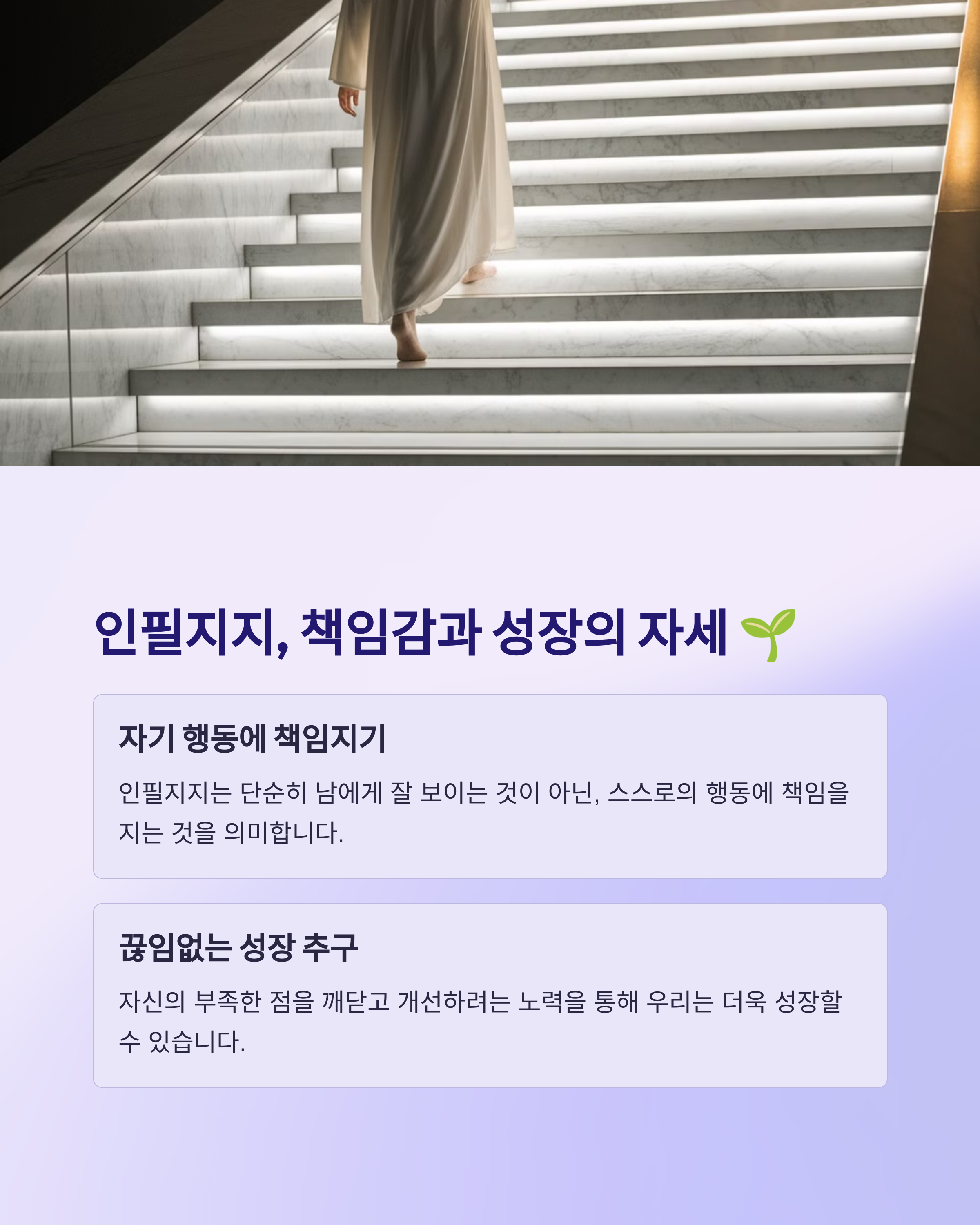 공자님은 제자들에게 자기 잘못을 지적해주는 것을 감사하게 여기셨습니다. 왜냐하면 다른 사람의 지적을 통해 자신의 부족한 점을 깨닫고 더 나은 사람으로 성장할 수 있기 때문이다. 인필지지는 단순히 남들에게 잘 보이라는 의미가 아니다. 자기 행동에 책임을 지고, 끊임없이 성장하려는 자세를 강조한다.