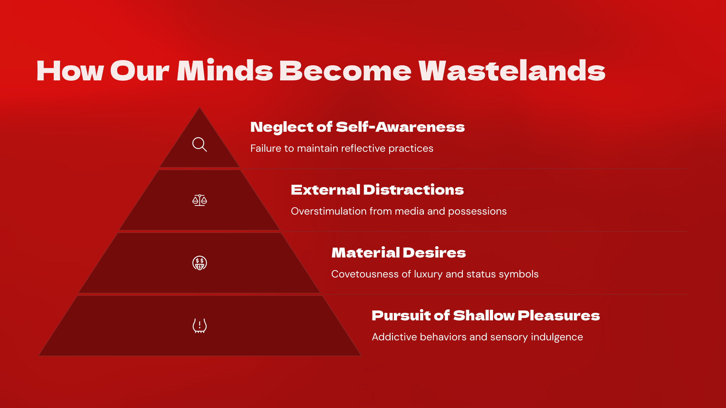 마음의 황무지는 본래의 순수한 마음을 잃고 외부의 자극에 휘둘릴 때 발생합니다. 남의 화려한 물건에 대한 탐욕, 과도한 취미 생활, 자극적인 쾌락 추구 등은 마음을 황폐하게 만드는 주범입니다.
