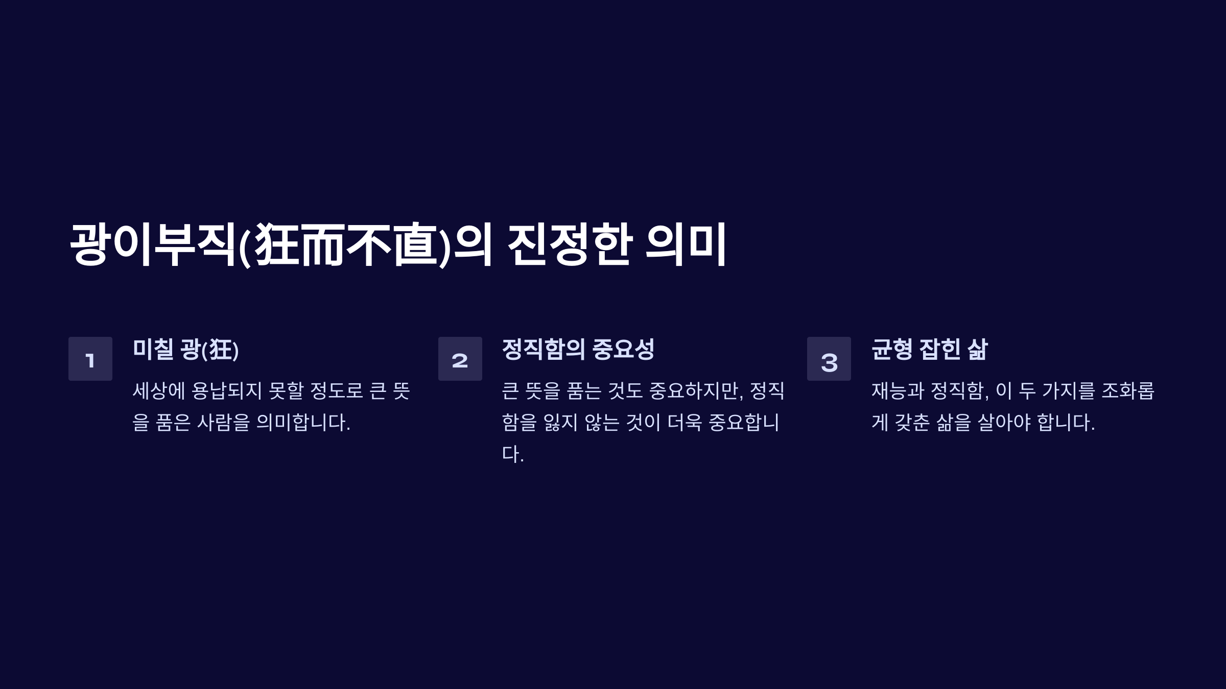 광이불직(狂而不直) 이라는 말은 단순히 미친 사람을 비판하는 말이 아니라, 우리에게 삶의 방향을 제시하는 지혜로운 말입니다. 이 말을 가슴에 새기고, 우리 삶에 적용해 보면 더욱 성숙한 사람으로 성장할 수 있을 것이다.