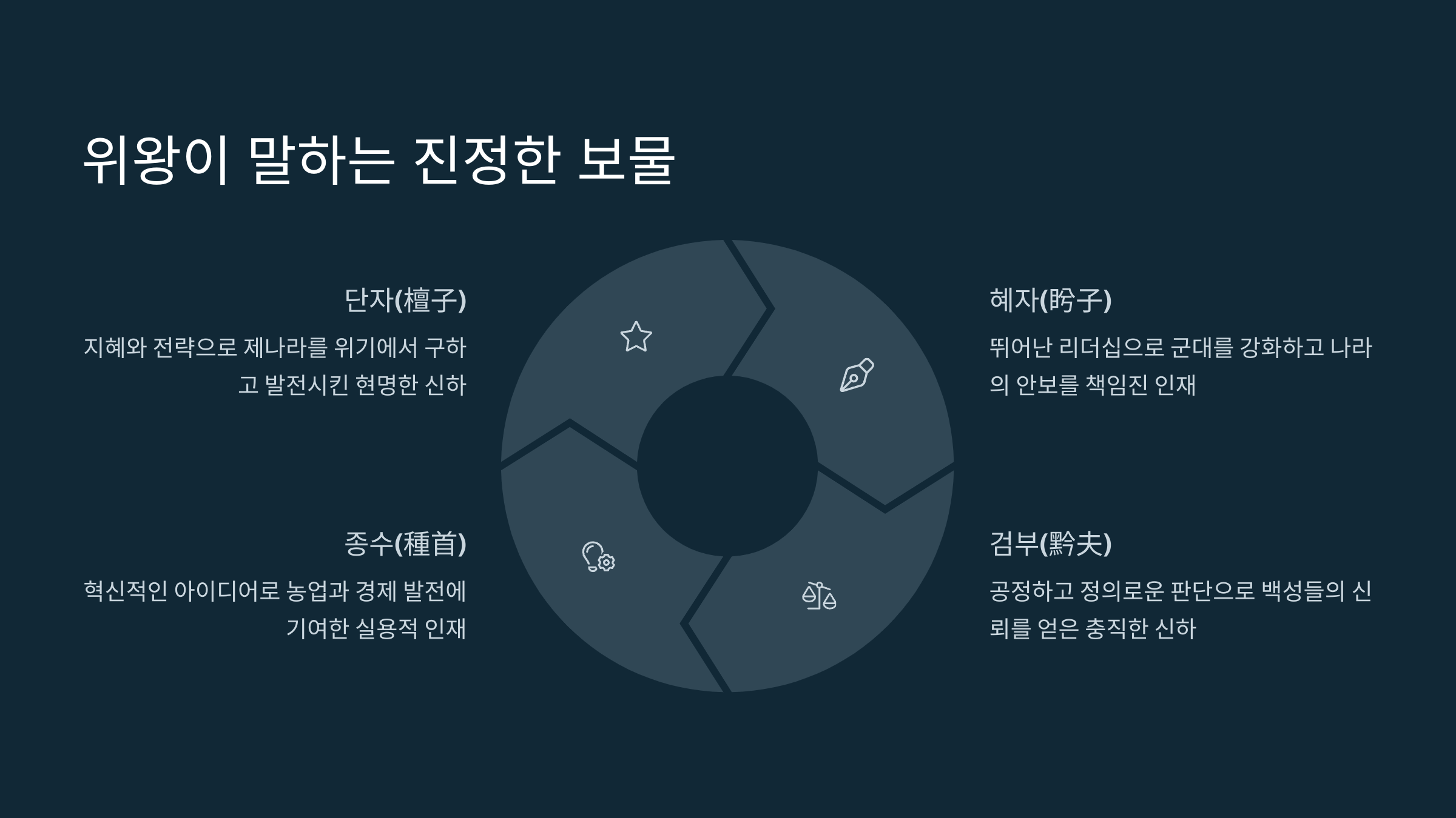 하지만 위왕은 "보물"이라는 단어에 대해 다른 해석을 내놓습니다. 그는 보물을 단순히 물질적인 것이 아닌, 사람의 능력과 가치를 의미하는 것으로 봅니다. 제나라의 단자(檀子), 혜자(盻子), 검부(黔夫), 종수(種首)라는 신하들은 각자 중요한 위치에서 나라를 지키고 번영시키는 능력을 발휘했습니다. 위왕은 이들이야말로 12대의 수레를 비추는 구슬보다 훨씬 소중한 보물이라며 강조했습니다.
