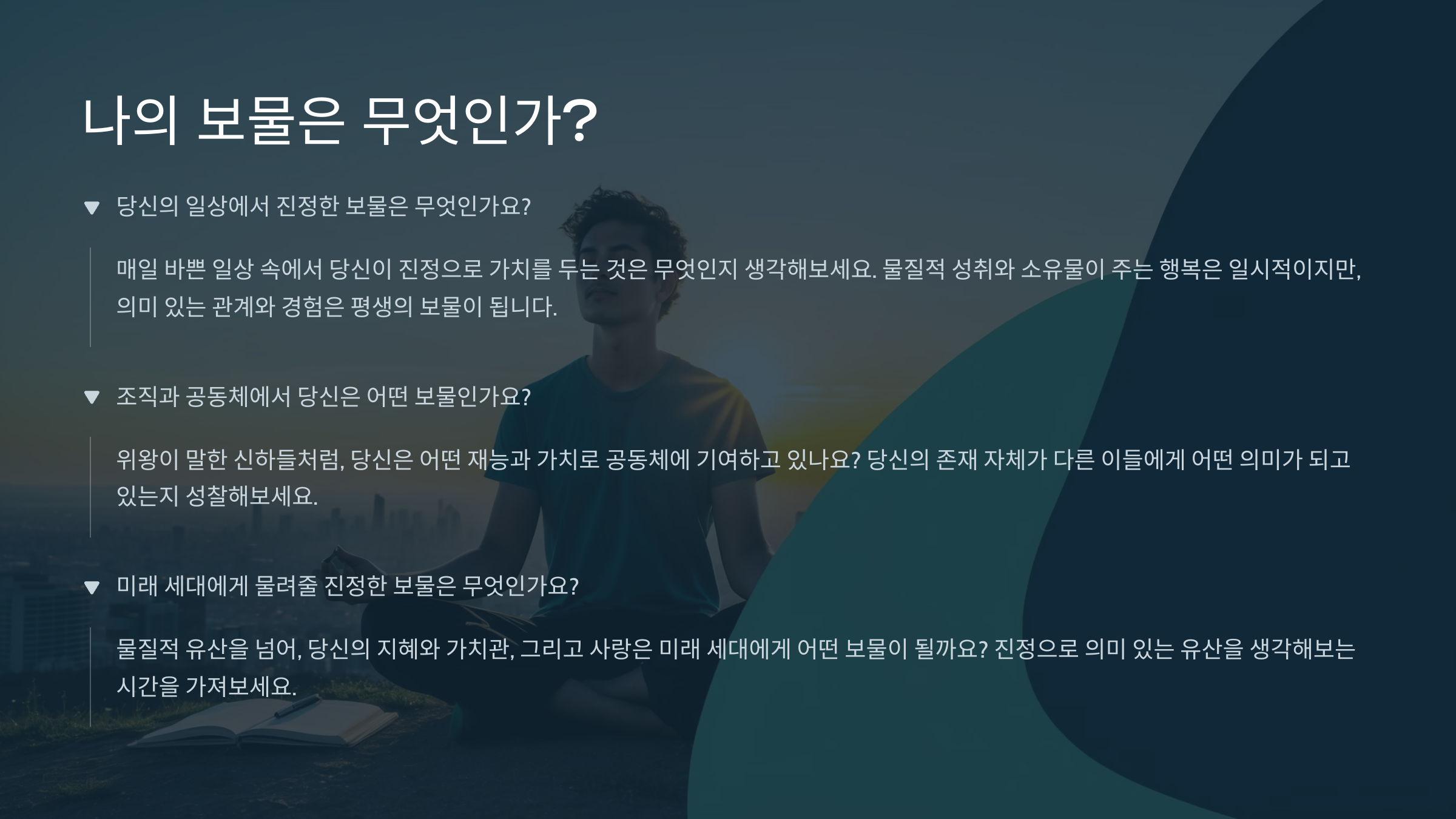 이 일화는 오늘날에도 우리에게 질문을 던집니다. 우리는 무엇을 보물로 여기는가? 물질적인 소유를 중시하고 있지는 않은가? 아니면 사람들의 가치를 인정하고 함께 성장해 나가는 데 더 가치를 두고 있는가?