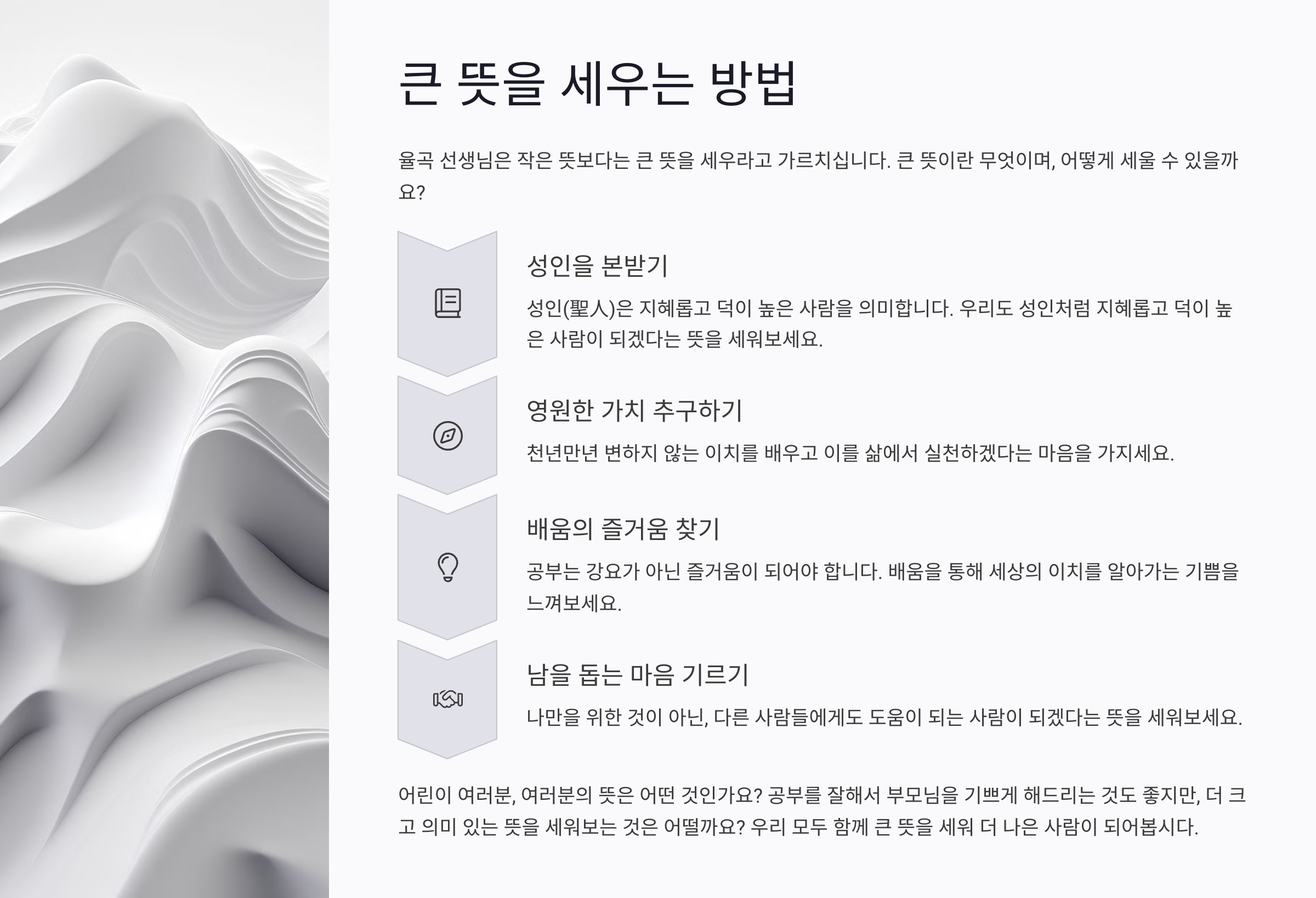 율곡 선생님은 작은 뜻보다는 큰 뜻을 세우라고 가르치십니다. 큰 뜻이란 무엇이며, 어떻게 세울 수 있을까요?
