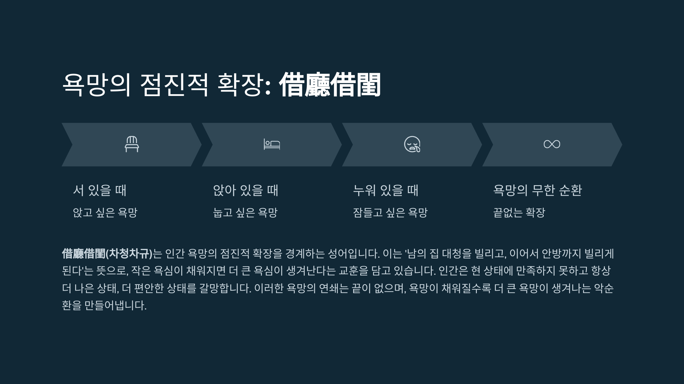 借廳借閨(차청차규)는 인간 욕망의 점진적 확장을 경계하는 성어입니다. 이는 '남의 집 대청을 빌리고, 이어서 안방까지 빌리게 된다'는 뜻으로, 작은 욕심이 채워지면 더 큰 욕심이 생겨난다는 교훈을 담고 있습니다. 인간은 현 상태에 만족하지 못하고 항상 더 나은 상태, 더 편안한 상태를 갈망합니다. 이러한 욕망의 연쇄는 끝이 없으며, 욕망이 채워질수록 더 큰 욕망이 생겨나는 악순환을 만들어냅니다.