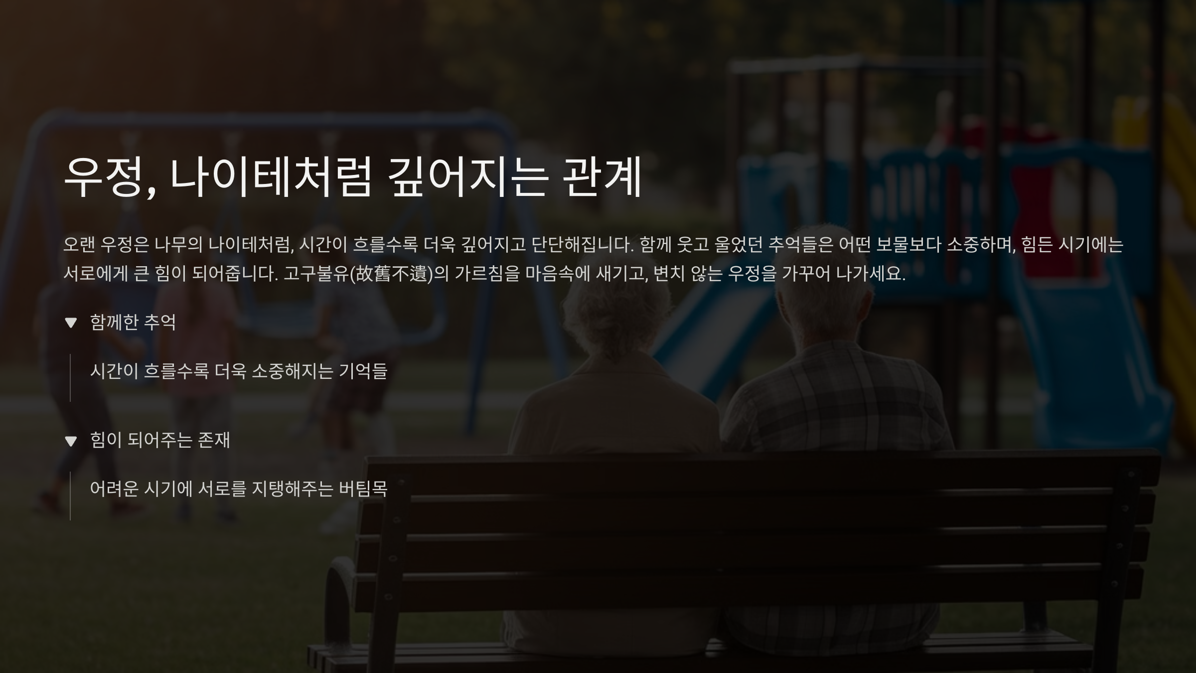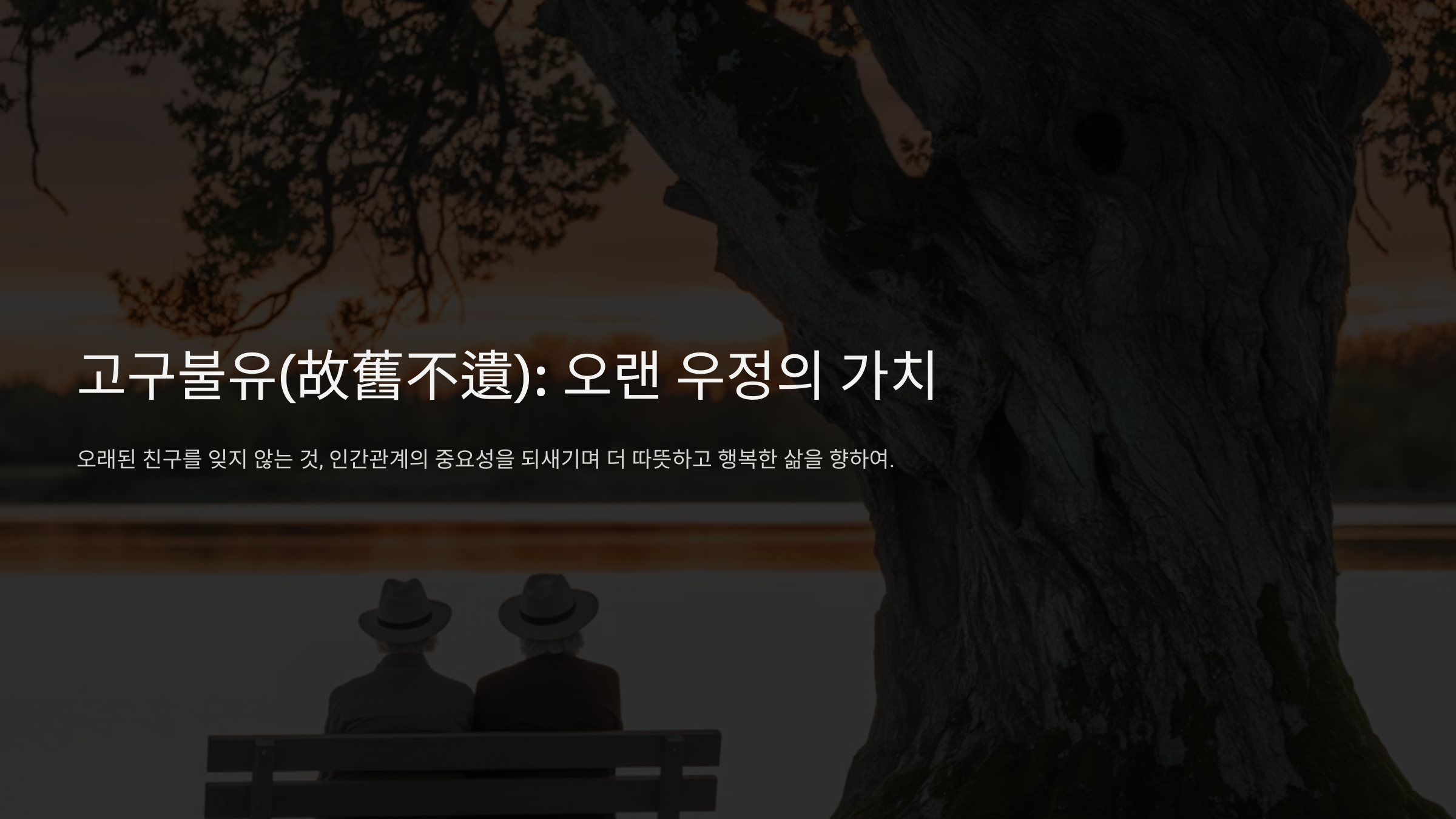 오늘날 우리는 다시 한번 인간관계의 의미를 되새겨야 한다. 특히 오랜 친구와의 관계를 소중히 여기고, 서로를 지지하며 함께 성장해야 한다. 고구불유(故舊不遺)라는 말은 단순히 친구를 잊지 말라는 의미를 넘어, 인간관계의 중요성과 진정한 행복이 무엇인지를 깨닫게 해준다.