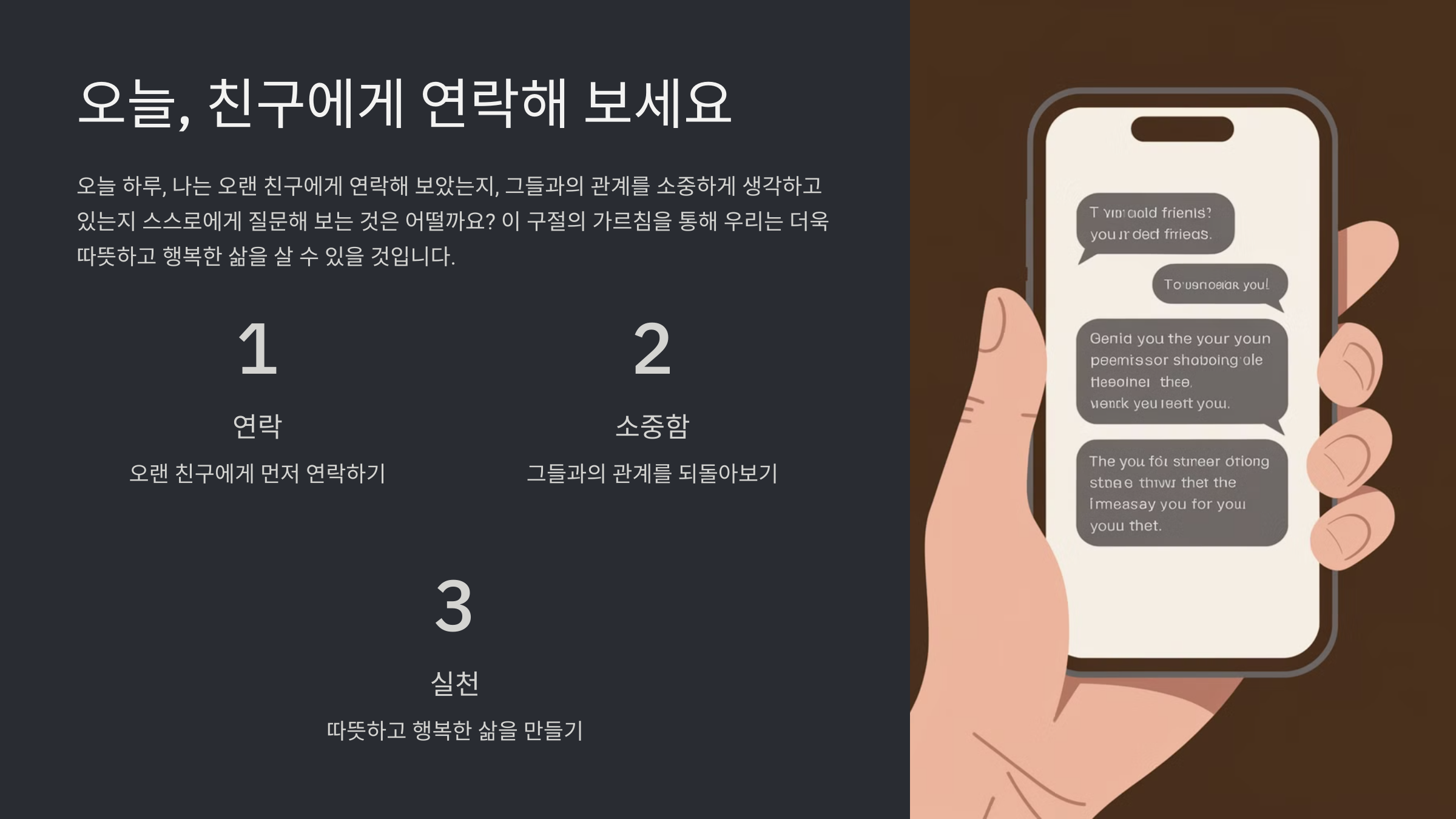 오늘 하루, 나는 오랜 친구에게 연락해 보았는지, 그들과의 관계를 소중하게 생각하고 있는지 스스로에게 질문해 보는 것은 어떨까요? 이 구절의 가르침을 통해 우리는 더욱 따뜻하고 행복한 삶을 살 수 있을 것이다.