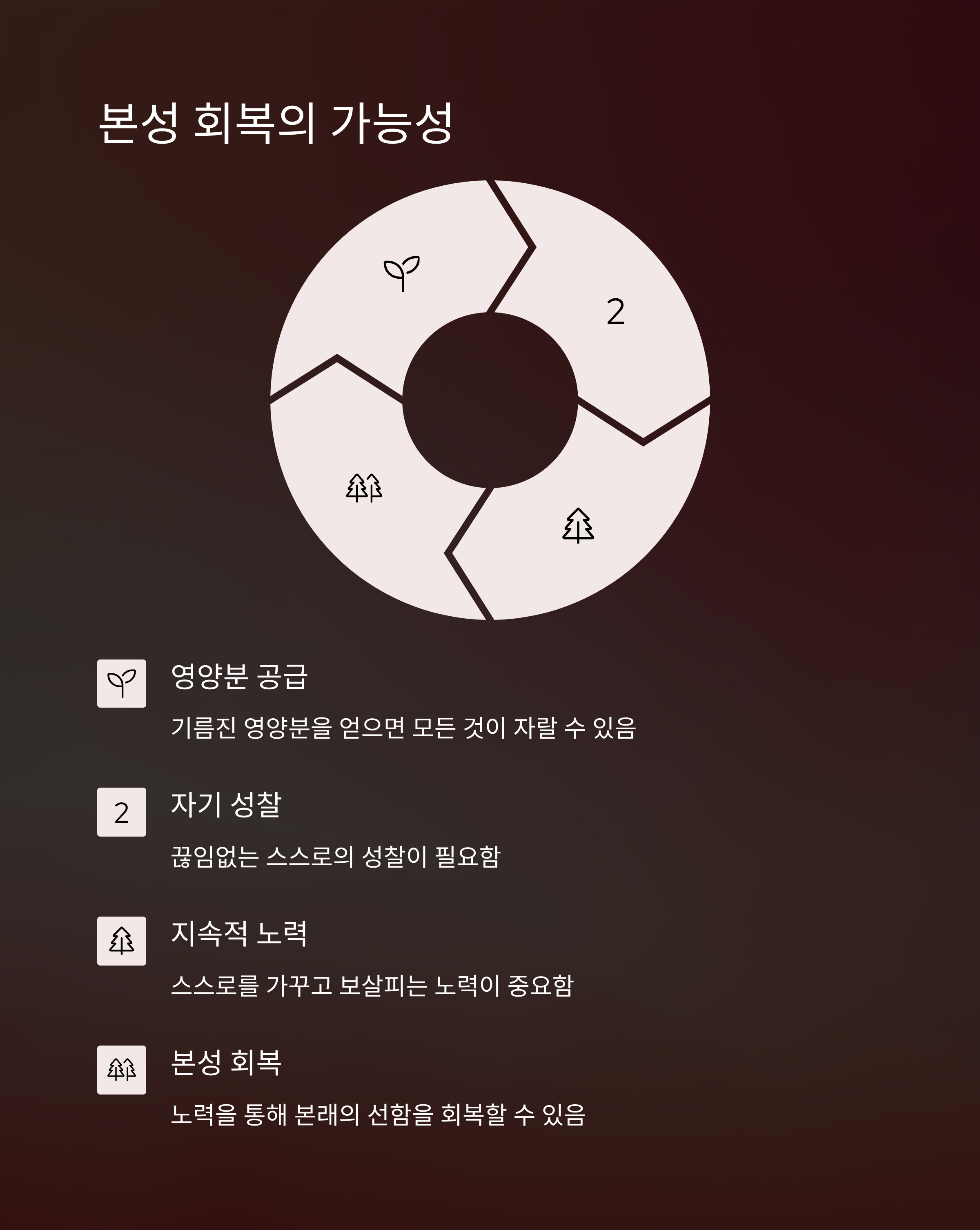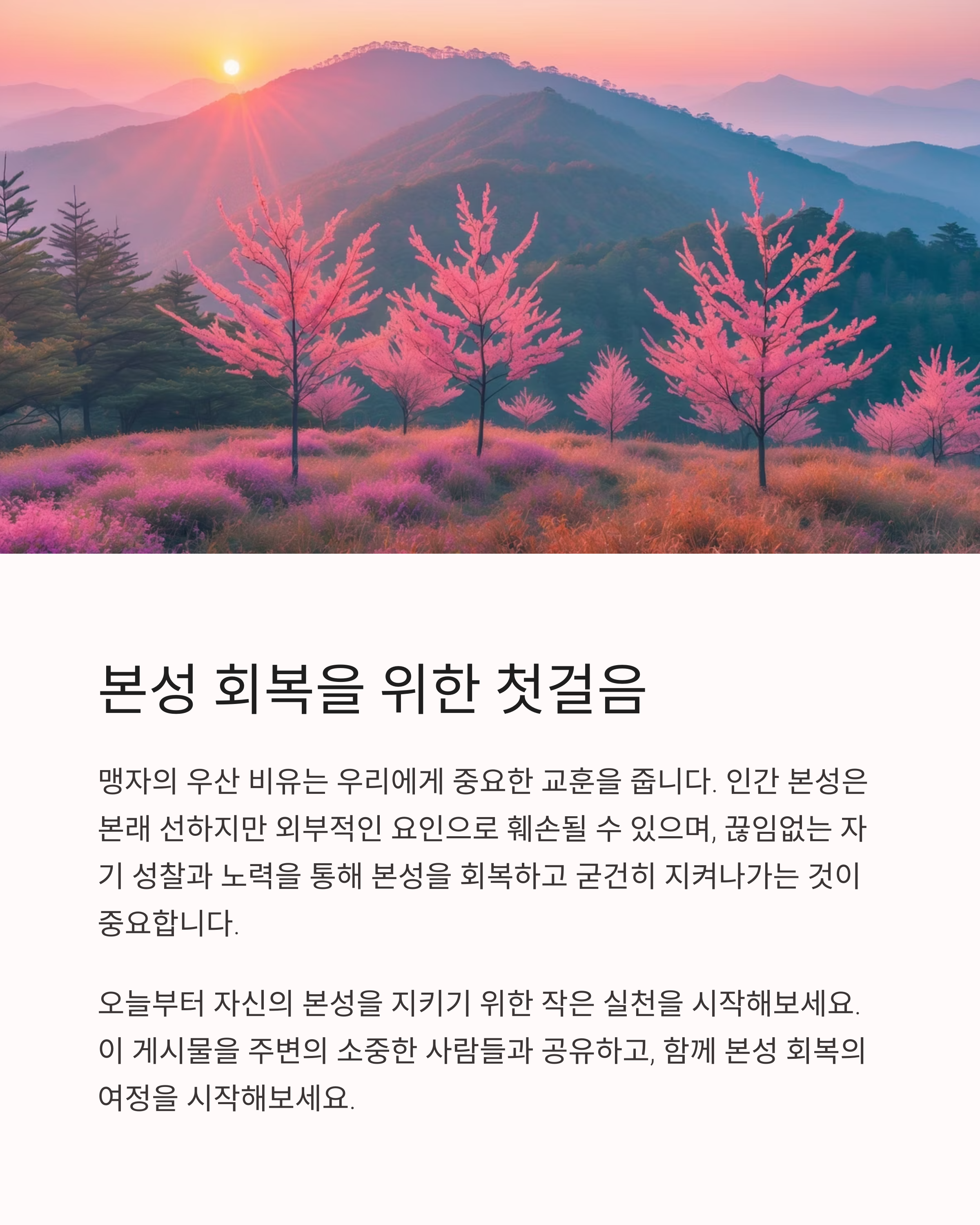 오늘부터 자신의 본성을 지키기 위한 작은 실천을 시작해보세요. 이 게시물을 주변의 소중한 사람들과 공유하고, 함께 본성 회복의 여정을 시작해보세요.