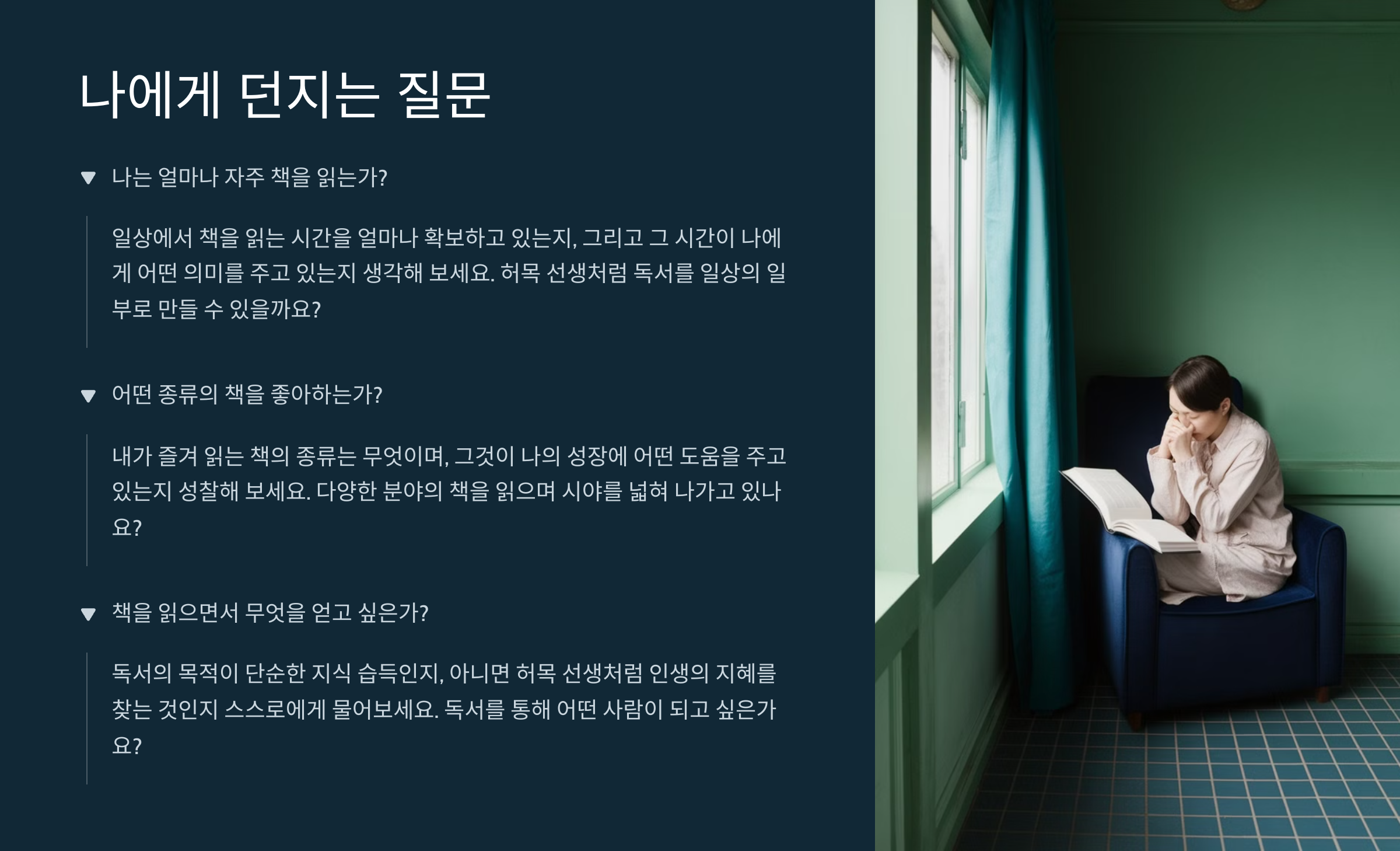 이러한 질문들을 통해 자신을 돌아보고, 독서를 통해 더 나은 삶을 살아갈 수 있도록 노력해야 한다.