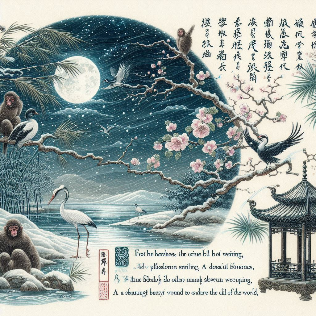 "원숭이 학처럼 맹세 새기며, 세상 추위 이겨내네." 시인은 원숭이와 학의 굳건한 맹세처럼, 어떠한 어려움과 시련 속에서도 자신의 신념과 가치를 지키며 살아가겠다고 다짐합니다. 원숭이와 학은 각각 지혜와 고결함을 상징하며, 이들의 맹세는 시인의 강인한 의지를 더욱 강조합니다. 변화하는 세상의 차가운 현실 속에서도, 우리는 변치 않는 가치를 추구하며 꿋꿋하게 살아가야 합니다.