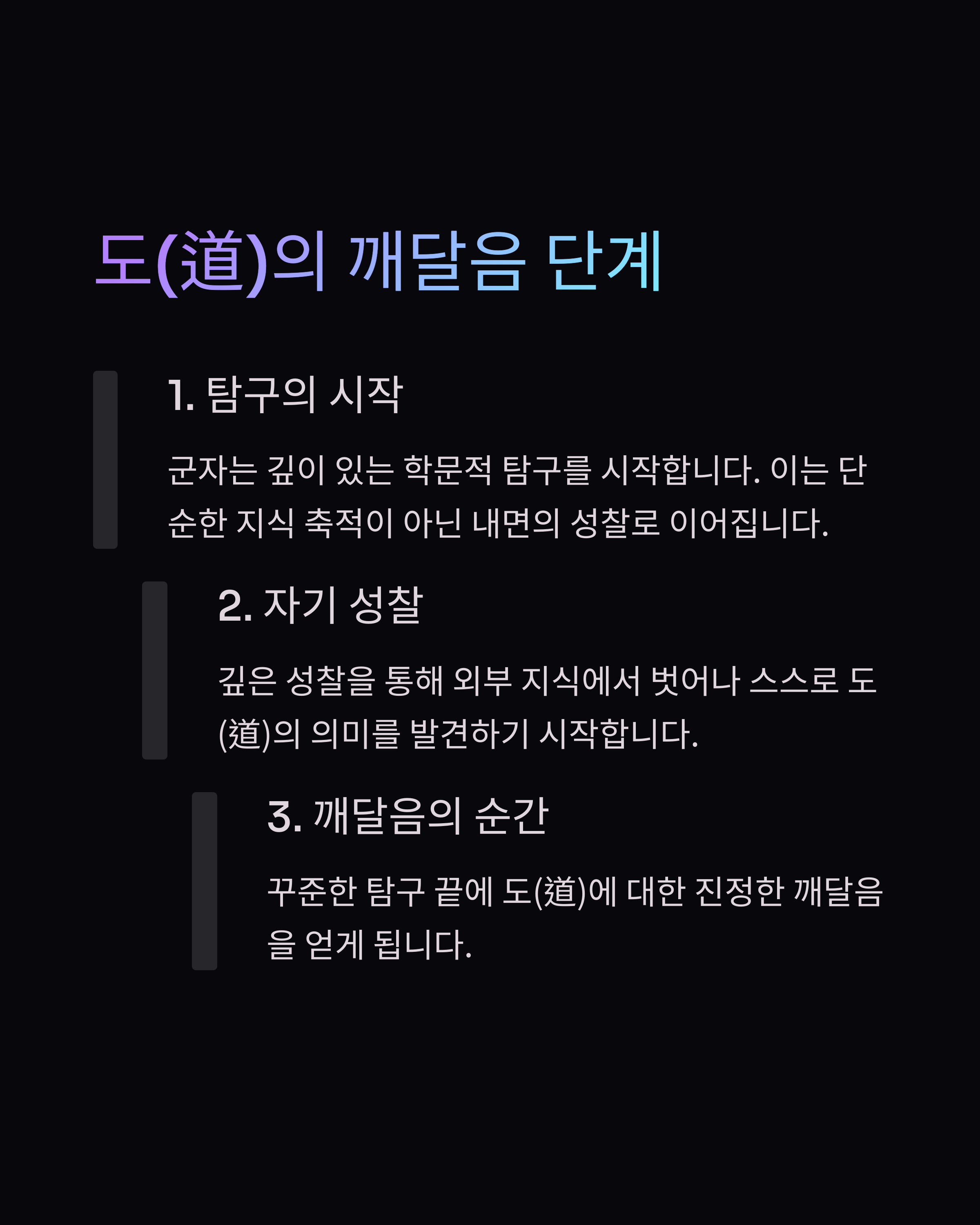 꾸준한 탐구 끝에 도(道)에 대한 진정한 깨달음을 얻게 됩니다.
