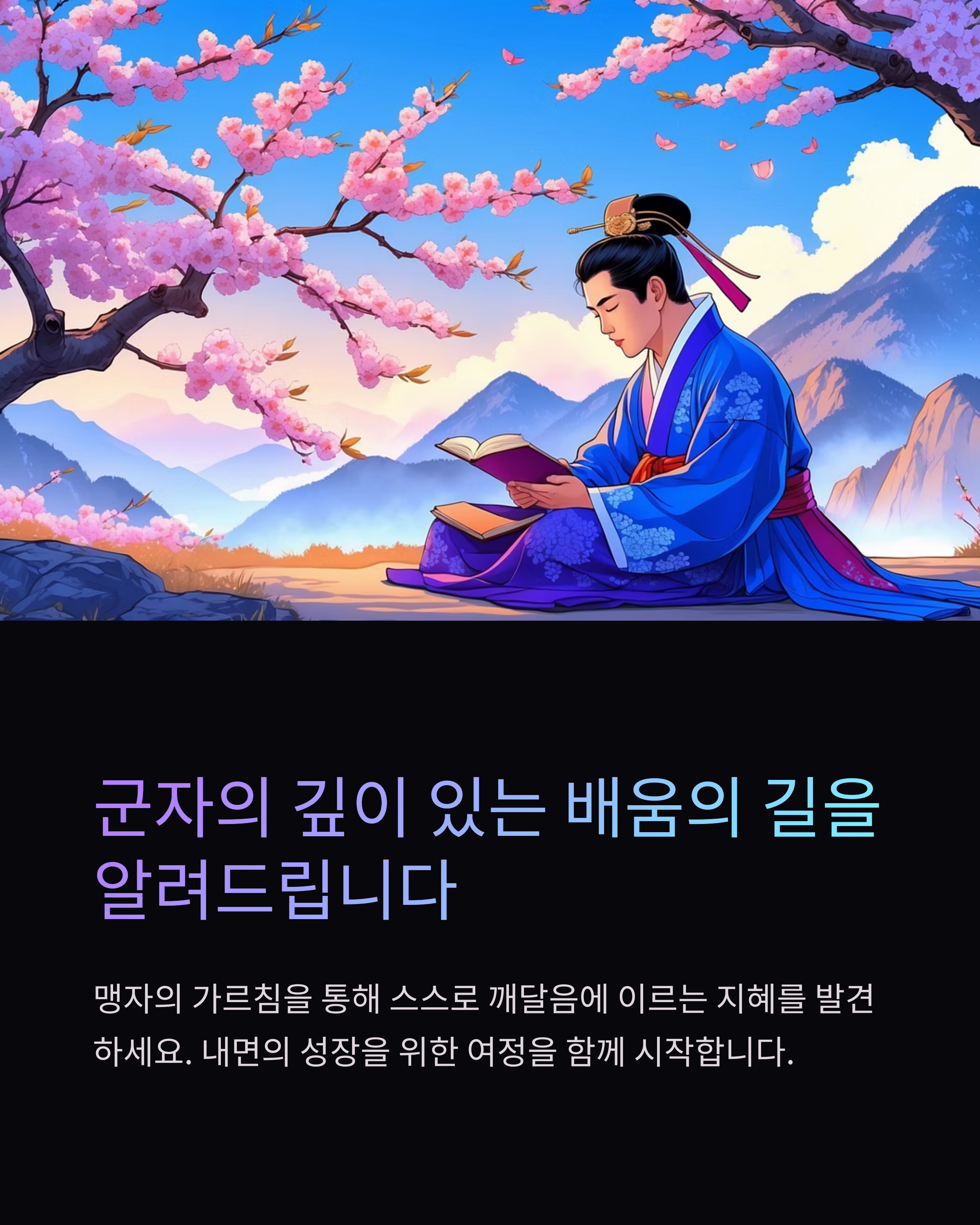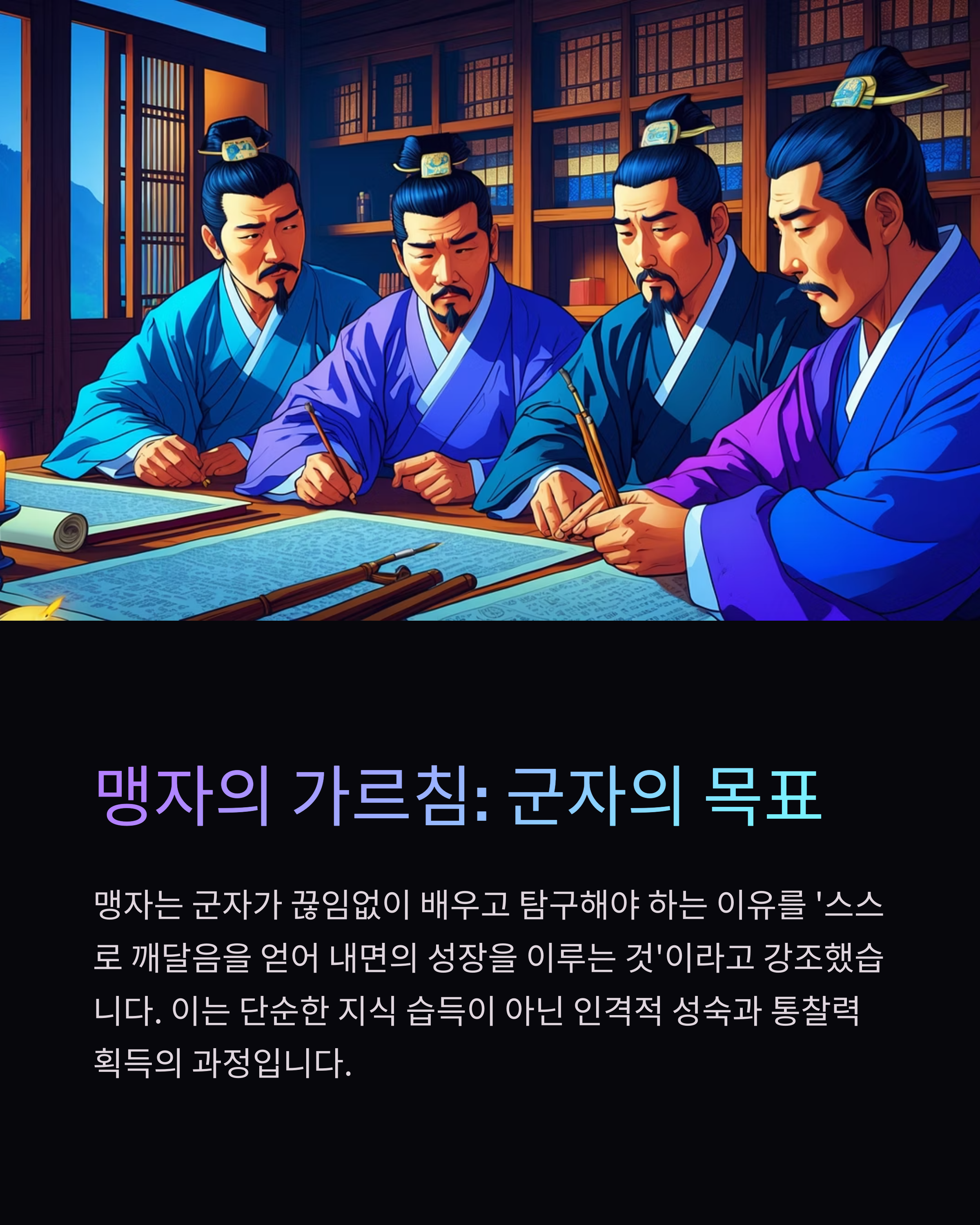 맹자는 군자가 끊임없이 배우고 탐구해야 하는 이유를 '스스로 깨달음을 얻어 내면의 성장을 이루는 것'이라고 강조했습니다.