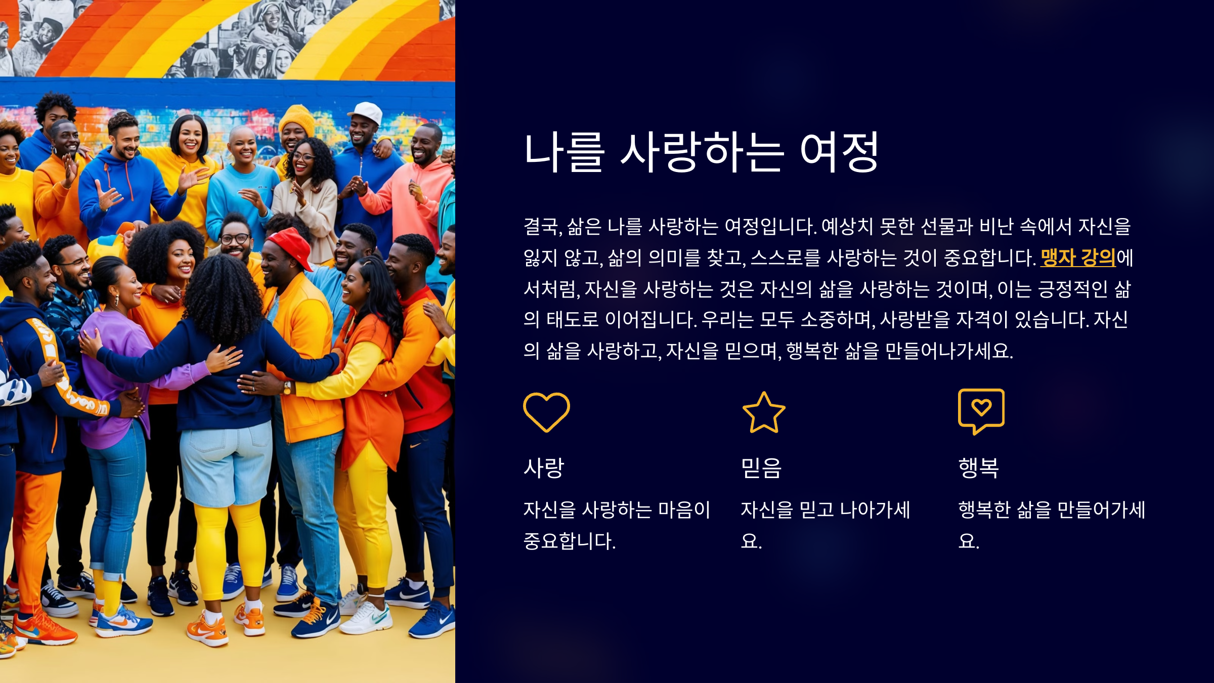 나를 사랑하는 것은 나의 삶을 사랑하는 것이다. 우리는 자신의 삶을 소중하게 여기고, 긍정적인 마음으로 삶을 가꾸어나가야 한다. 삶의 모든 순간을 감사하며, 자신의 삶을 사랑하는 마음으로 살아가는 것이 중요하다.