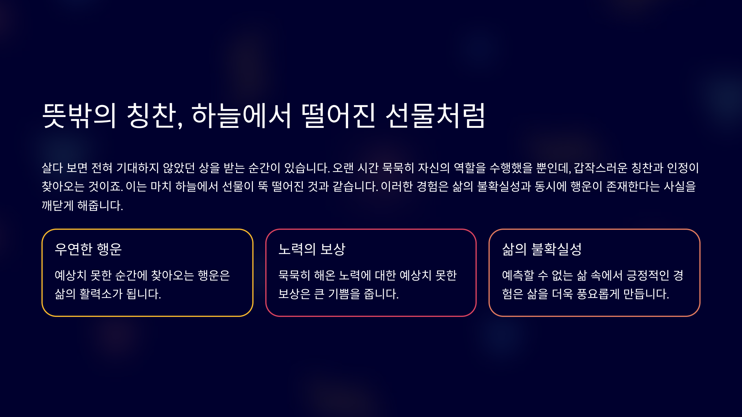 이 글은 삶의 예측 불가능성과 인간관계의 복잡성을 탐구하며, 예상치 못한 순간에 찾아오는 칭찬과 비난의 경험을 성찰합니다. 예상치 못한 상은 마치 하늘에서 떨어진 선물처럼 우리를 놀라게 하고 삶의 희열을 선사하지만, 완벽함을 추구하는 과정에서 마주하게 되는 비난은 우리의 노력을 오히려 좌절시킬 수 있습니다.