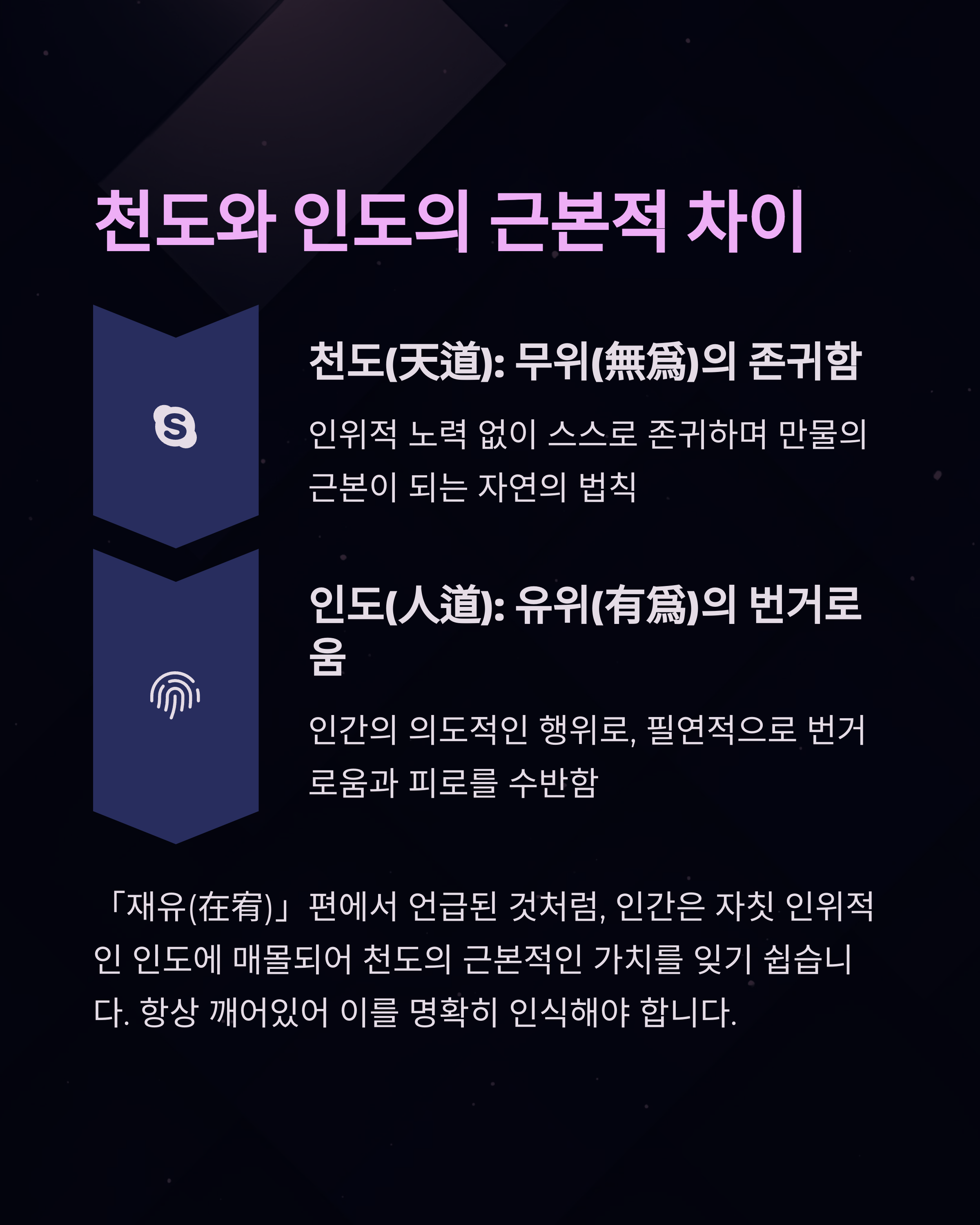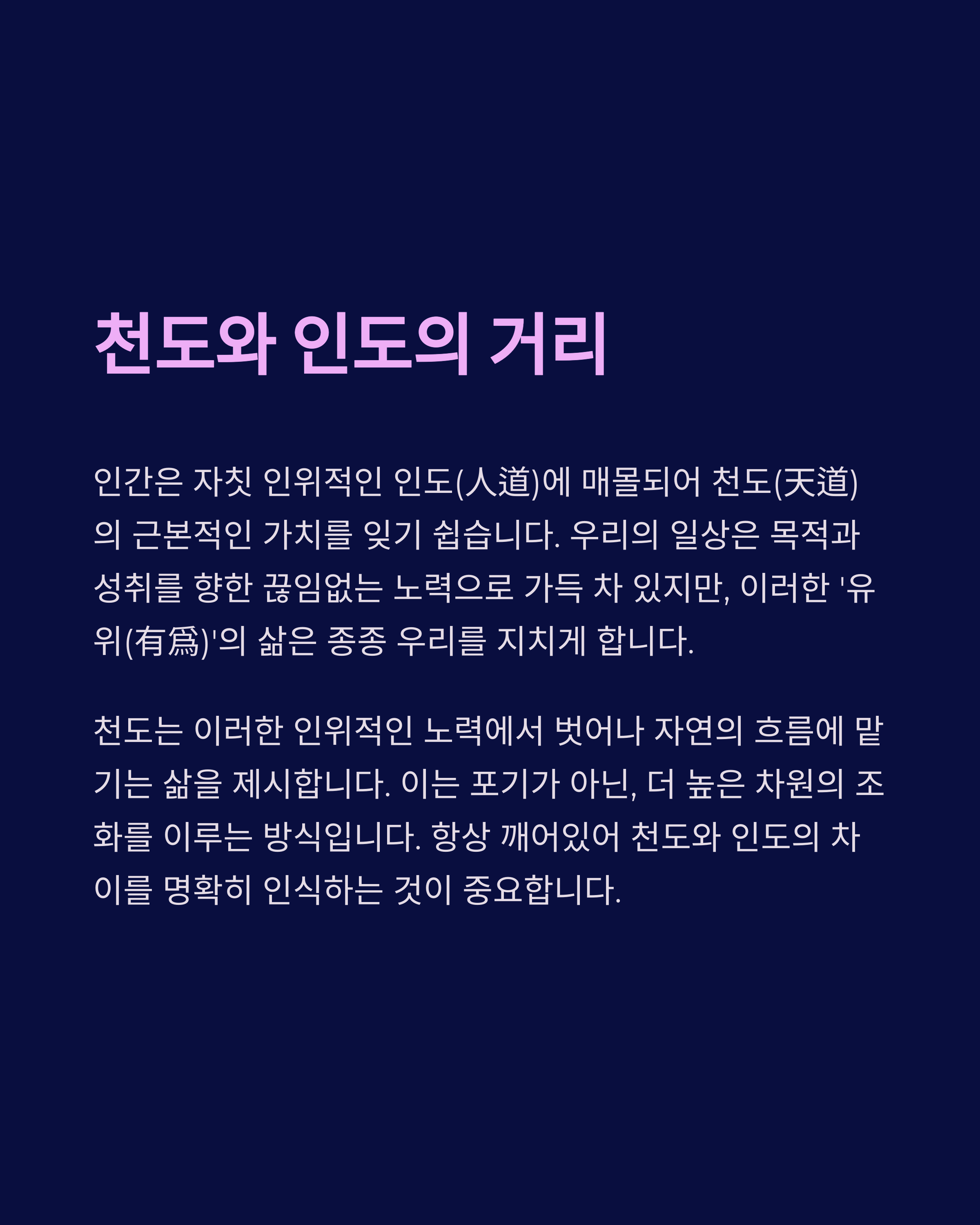 인간은 자칫 인위적인 인도(人道)에 매몰되어 천도(天道)의 근본적인 가치를 잊기 쉽습니다. 우리의 일상은 목적과 성취를 향한 끊임없는 노력으로 가득 차 있지만, 이러한 '유위(有爲)'의 삶은 종종 우리를 지치게 합니다.