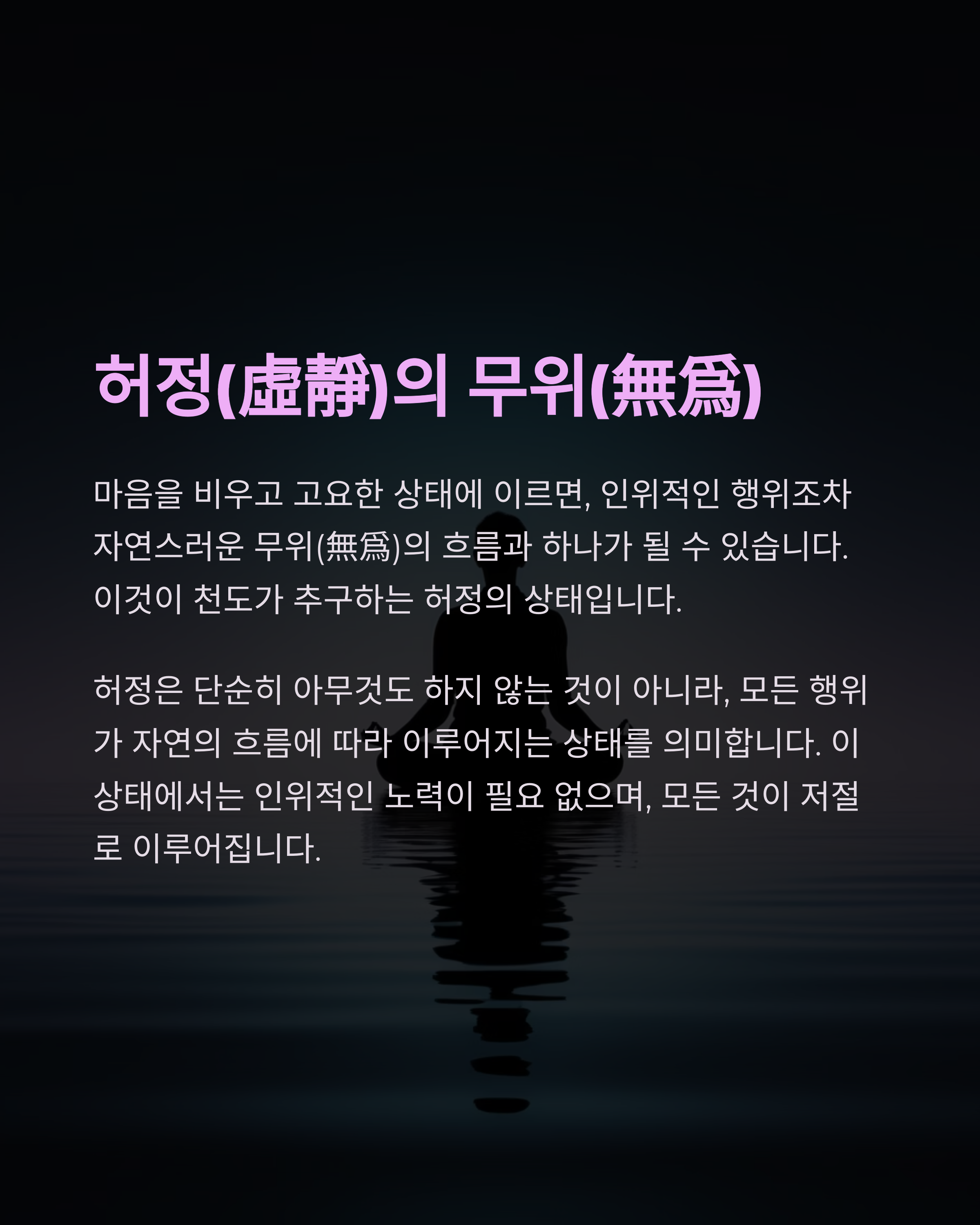 마음을 비우고 고요한 상태에 이르면, 인위적인 행위조차 자연스러운 무위(無爲)의 흐름과 하나가 될 수 있습니다. 이것이 천도가 추구하는 허정의 상태입니다.