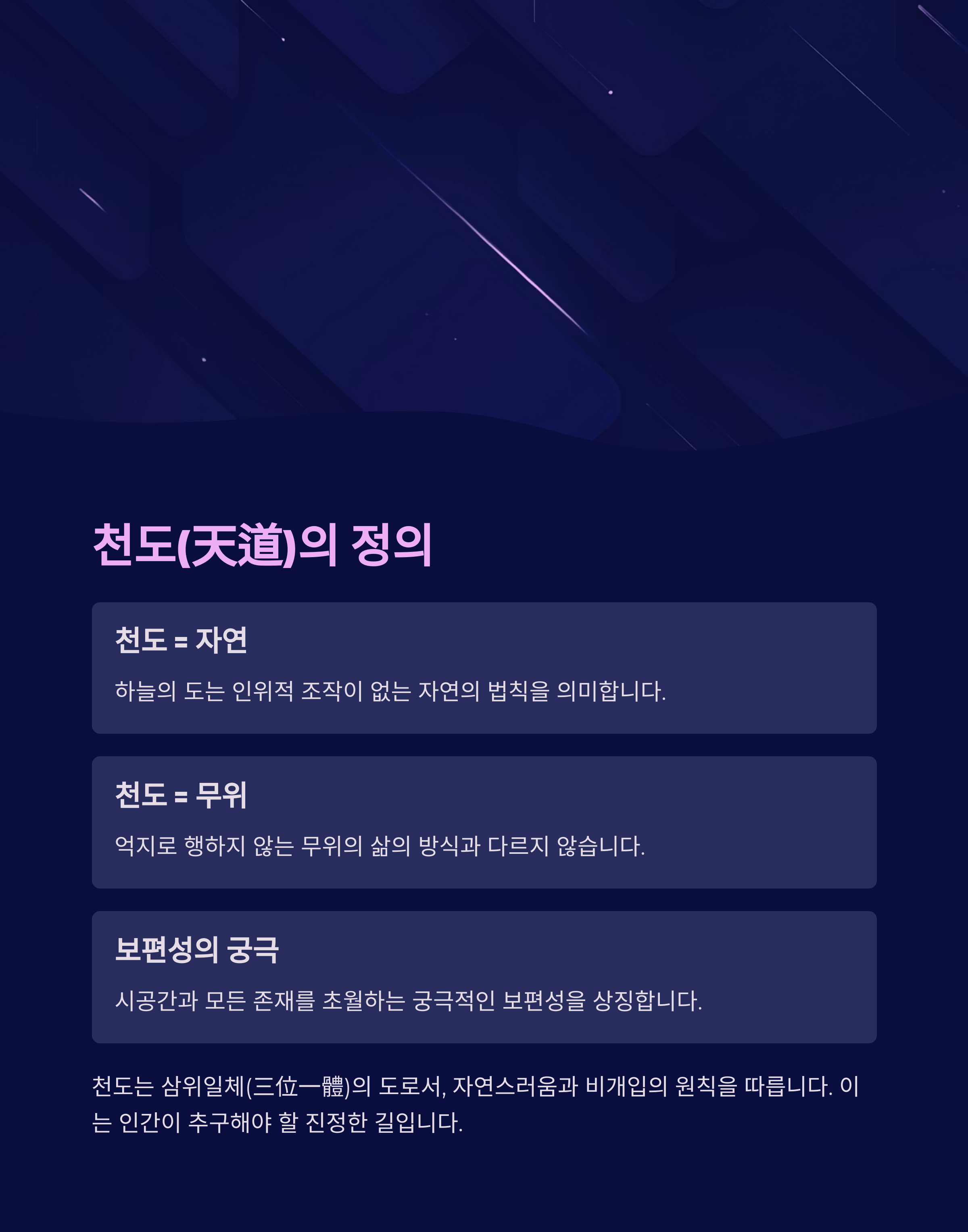 천도는 단순한 개념이 아니라 우주의 근본 원리이며, 모든 존재의 본질적인 흐름을 나타냅니다.