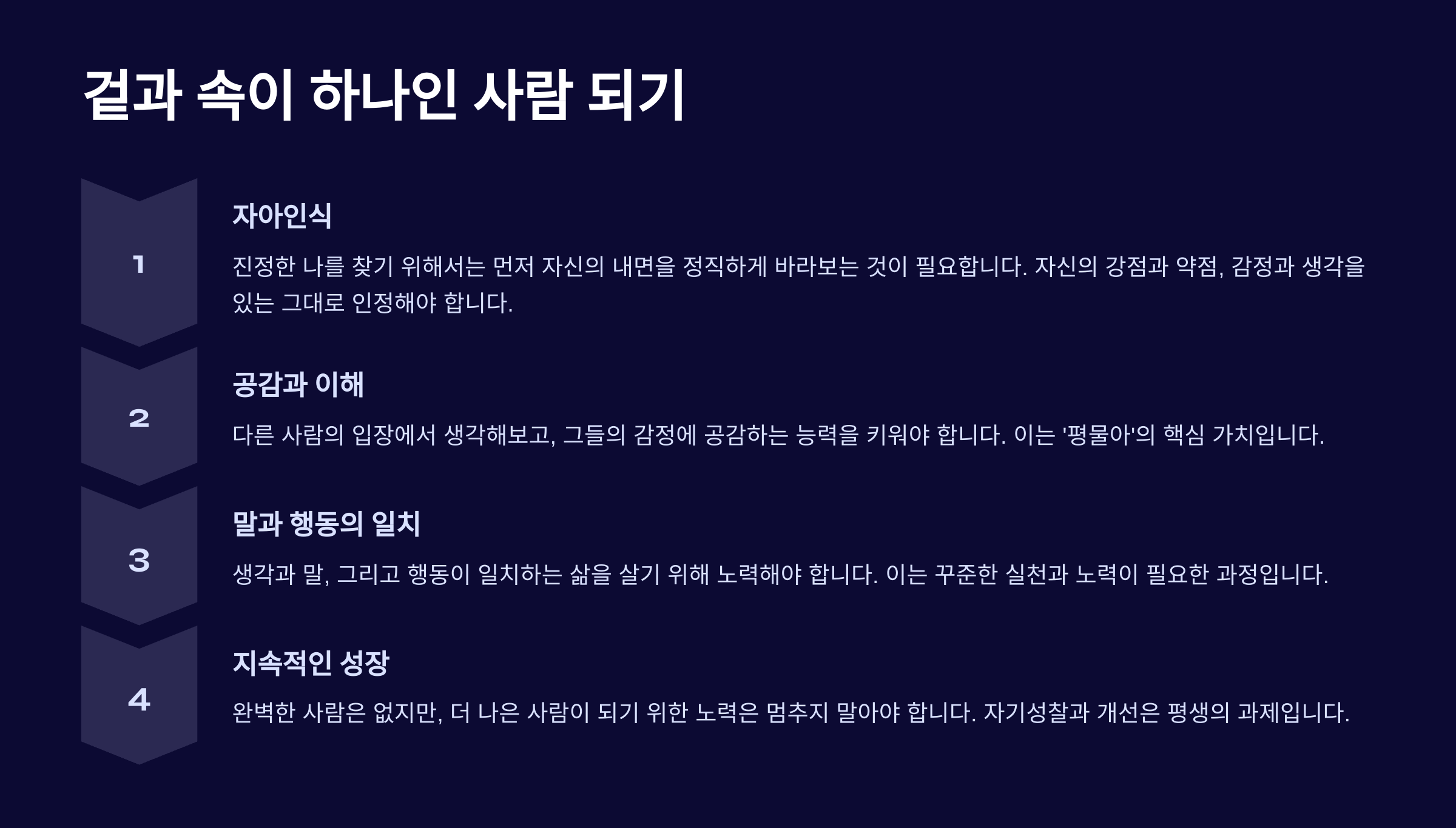 ‘평물아’라는 말은 '남과 나의 입장이 같다'라는 의미다. 즉, 다른 사람의 아픔을 자신의 아픔처럼 느끼고, 그들의 처지에서 생각해 보는 것이다. 이렇게 되면 우리는 더 이상 남과 나를 구분하지 않고, 모든 사람을 하나의 존재로 바라볼 수 있게 된다.