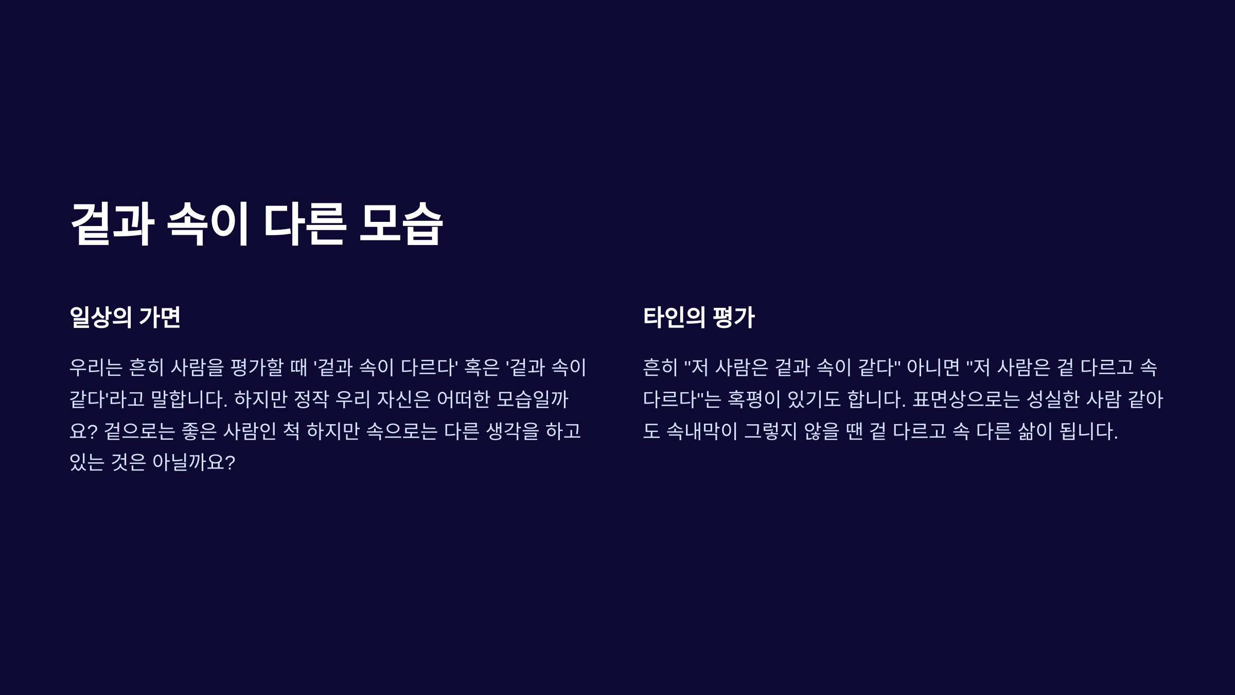 오늘 하루, 나는 겉과 속이 다른 모습을 하고 있지는 않은지 스스로에게 질문해 보는 것은 어떨까요? 이 구절의 가르침을 통해 우리는 더욱 성숙하고 행복한 삶을 살 수 있을 것이다.